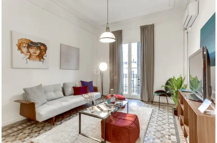 📌Aragon 📌Carrer d'Aragó Barcelona The spacious, colorful three-bedroom Aragon vacation apartment in the hip Eixample quarter will welcome you to Barcelona. With stunning tiled floors, painted decorative accents, wooden shutters, and a wrought-iron balcony, our local interior designer has transformed this apartment into a perfect example of Catalan design. The three bedrooms, along with a plush sofa bed, can sleep up to eight guests, suitable for families who want to experience the city. Sit and sip a glass of wine on the charming European-style balcony. Begin your adventure at the central Plaza Catalunya (10 min. walk), then explore Barcelona’s famous art and history museums (10-15 min), including the Barcelona Museum of Contemporary Art, the Egypt Museum, and the Picasso Museum. Bus stops are right outside, and the Universitat and Passeig de Gracia metro stops are close (7 min). Families and groups of friends will love this apartment in the heart of historic Barcelona. Premium amenities such as a state-of-the-art kitchen, free WiFi, cable TV, hotel beds and linens, and a Nespresso machine ensure that you’ll have everything you need for a pleasant stay. Please note that one of the bedrooms is accessed through another bedroom and that due to the location on the bustling Aragon street, some ambient noise may be heard in the living room. Please be aware that HousingAnywhere is an online booking platform. Therefore exchanging contact details and offering viewings is not possible. If you would like to reserve this accommodation, send me a booking request or a message and please mention your age and occupation. I look forward to meeting you...