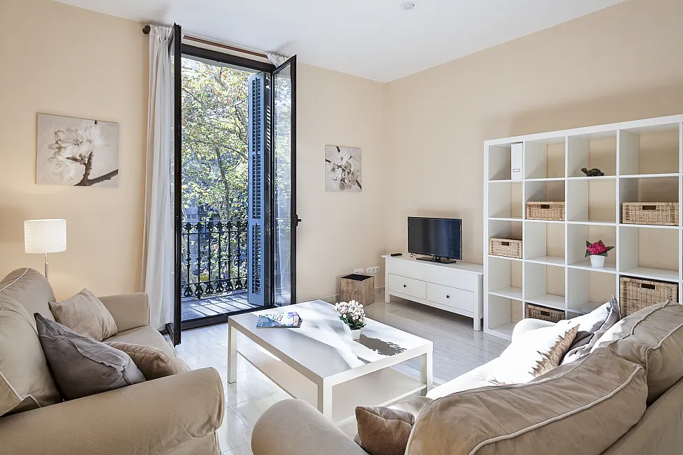 ✨ RENTAL CONDITIONS: - Landlord's Other Fee: 18% of the total rental value (amount of 1 month calculated in the Rent Summary as "Other". The total amount of the full stay will be charged at the move-in date) - Deposit (refundable) to be indicated depending on the stay length. With its soothing and sophisticated combination of white and pinkish beige tones, and an abundance of light and cool breeze flooding in through the floor-to-ceiling balcony doors, perhaps the best word to describe this apartment is "fresh." The flat has 2 bedrooms. 1st room: 1 double bed 2nd room: 2 single beds Living room: 2 double sofa beds In the living room you will find 2 very soft and comfortable couches facing a TV, gorgeous floral paintings adorning the walls and access to a balcony overlooking the bustling avenue below. A long hall with polished tile floors leads to the bedrooms: one with 2 individual beds and an enormous wooden armoire, and a sunny master bedroom with a large double bed, 2 armoires, a cozy study nook with a small desk and chair, and access to both a private balcony with a washing machine and an ensuite bathroom with a shower. The apartment has another full bathroom with gorgeous marble-like tiles on the walls, as well as a fully equipped kitchen ready for you to cook all of your favorite dishes. To truly feel like a local we recommend walking to Mercat de Ninot and buying some fresh ingredients to prepare at home. The apartment is located close to the Rocafort (L1) metro station with direct access to Plaza Catalunya and the famous Arc de Triomfo. You will be within a short walk of Plaza Espanya, the Magic Fountain of Montjuic and the Fira de Barcelona. The apartment is close to a huge selection of great restaurants and bars, many in Eixample near Enric Granados street and some excellent tapas bars on Carrer Blai street in the Poble Sec neighborhood. GENERAL CONDITIONS: - The rent will be collected on the same day of the month as the check-in date. * If during the last month you stay less than 10 days after that date: you'll pay per extra day * If during the last month you stay more than 15 days after that date: you'll pay one extra month Please be aware that HousingAnywhere is an online booking platform. Therefore exchanging contact details and offering viewings is not possible. If you would like to reserve this accommodation, send me a booking request or a message, and please mention your age and occupation. I look forward to meeting you! 8.-Arrivals policy: Monday to Friday: 15h - 18:30: Free of charge 18:30 - 21:00: 30€ 21:00 - 23:00: 50€ 23h or after: under request Weekends and public holidays: 15h - 21:00: 30€ 21:00 - 23:00: 50€ 23h or after: under request ** From 10:00 p.m. at 8:00 am. you must be quiet. Parties not allowed. Smoking not allowed. If the police come to the apartment or the neighbors call the Government/Police, you will be evicted from the apartment and/or have to pay a fine. - The apartment does not have any food (there is no coffee, salt, oil, sugar). - We provide guests with a kit of welcome amenities (1-2 toilet rolls, neutral soap in small quantities - they are not for the entire stay). There are always towels and sheets...