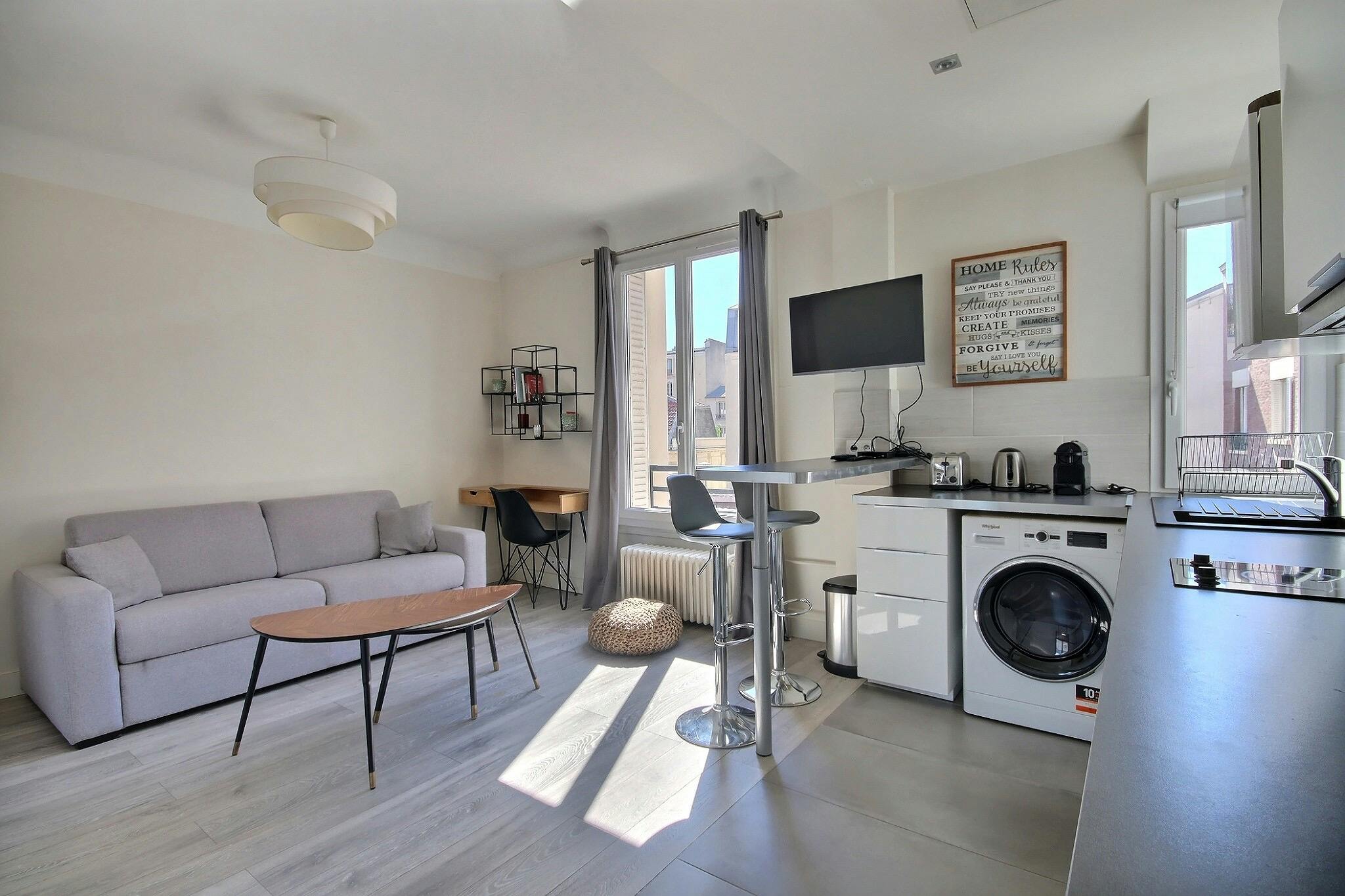 Furnished Apartment rental Studio - 22m2 - Levallois-Perret / Anatole France - Levallois-Perret This 22 m2 apartment, Studio, is located rue Barbes in Levallois Perret, on the 2nd floor of a 20th century building and can accommodate 2 people. This apartment is equipped with: washing machine, tumble dryer, cable channels, television, unlimited high-speed internet access with wifi. The 20th-century building is equipped with an entry code. The rent includes complimentary home insurance. IMPORTANT: Your booking will be confirmed ONLY when you will sign the lease and pay agency fees plus a security deposit after reservation on Housinganywhere. Agency fees will be 15% of the total rent, with a maximum amount of 1400 EUR for 12 months or less, and 8,5% of the total rent, with a maximum amount of 2800 EUR otherwise The refundable security deposit will be 1400 EUR if your rental is for 5 months or less, and 2800 EUR otherwise. If you want to pay the rent monthly, you will also have to provide documents such as payslips or tax notices showing that you or your guarantor can pay the monthly rent....