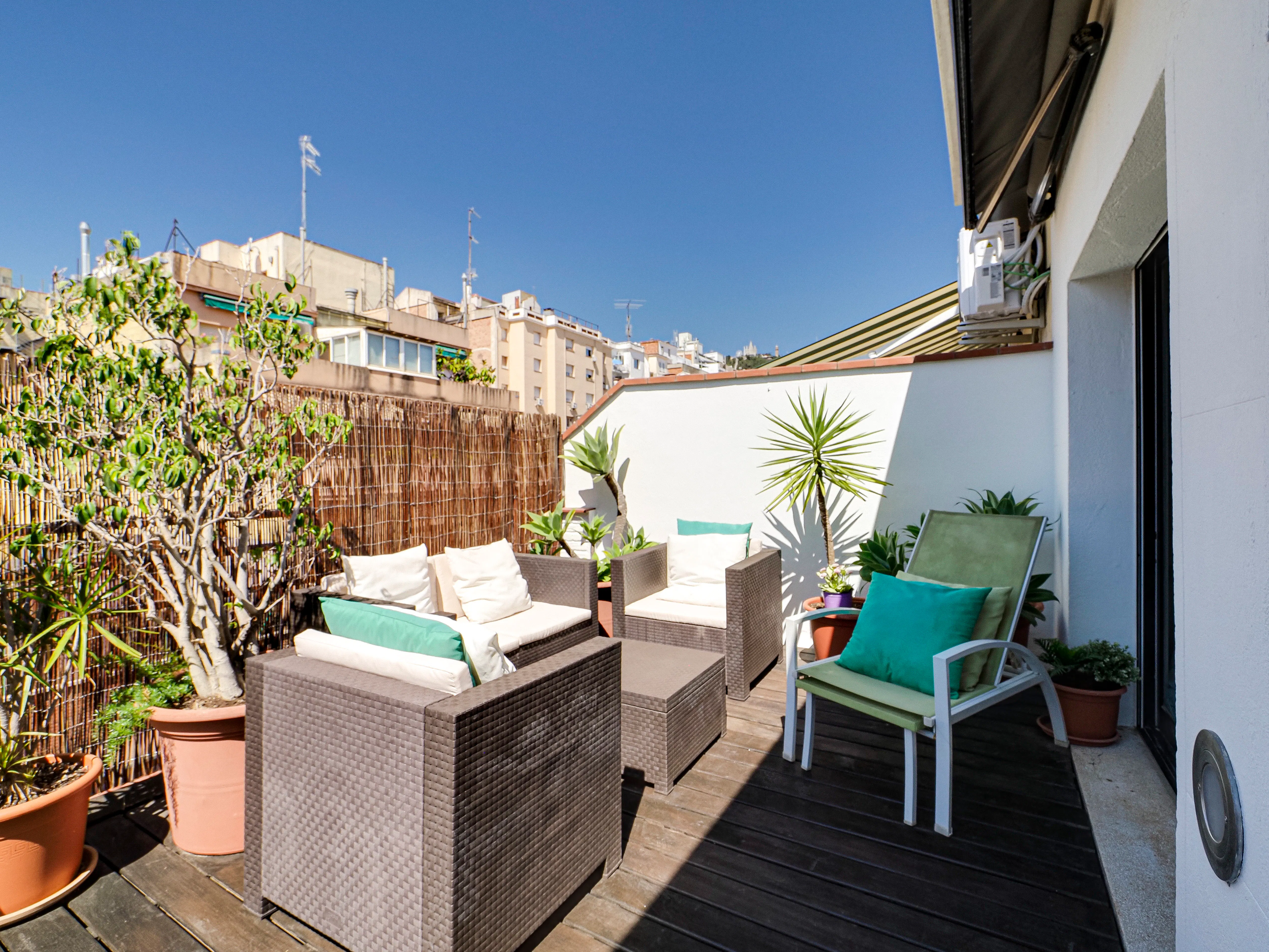 Apartment with an incredible terrace. Located in the quietest part of the Gracia neighborhood of Barcelona. It has a very good connection to the entire city with public transport, a few minutes away there is the Metro, Railway and bus stop. The apartment has a dining room that connects to the terrace and through which a lot of natural light enters, a fully equipped kitchen with everything you need, a double room with a large window and a recently renovated full bathroom...