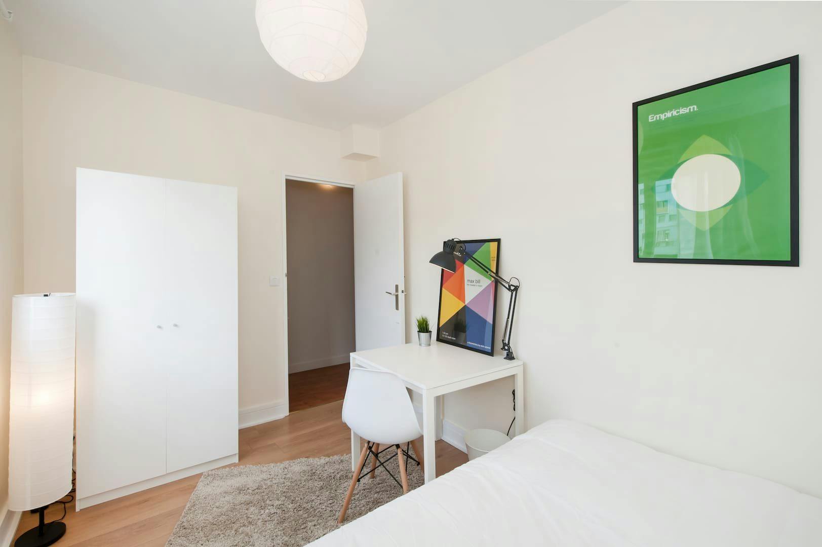 Furnished flat share ! All our flats are located in the city centre and close to all amenities and public transport (Metro, Tramway and Bus). This lovely private bedroom in a fully equipped, furnished and all-inclusive flatshare in Paris is a mix of comfort and design. It has got household furnishings, including a bed with pillows and duvet What is missing is your things to feel at home! The room can be locked if you need intimacy. All our rooms are fully furnished (bed, desk, wardrobe, duvet, pillows...). The flatshare is located in the "Alesia" neighborhood, in the centre of Paris. A lot of shops, public transports, restaurants are located near at hand. The apartment is on floor #5 , with elevator. It is ready-to-live-in and is composed of a large kitchen with refrigerator, kitchen ustensils, kettle, pans, toaster, crockery, microwave... The flat also has a washing machine, an iron, an ironing board, a clothes rack. Additionally, you will find cleaning items in the accommodation: bagless hoover, mop and bucket, dustpan and brush, broom... Every furnished flatshare includes all bills: household waste tax, condominium fees, unlimited wi-fi, electricity, housing insurance, water. All our flats are fully equipped (washing machine, dishes, decoration...) by our teams, who also take care of the technical and material maintenance. Minimum stay : 1 mois Apartment eligible for CAF up to 258€ / month. The CAF for Caisse d'allocations familiales is a free public service eligible for all, including foreigners and can help you financially to pay part of your housing according to your situation whether you are French or foreign. To find out the potential amount of your assistance, go to the CAF website and complete the online APL (housing assistance) estimate. Service fee : from 990€ The service fee covers the writing of the lease but also the assistance throughout your stay. The service fee covers the repair and maintenance of the equipment as well as access to our ultra-reactive support in case of need for intervention in your accommodation. Deposit : 1200...