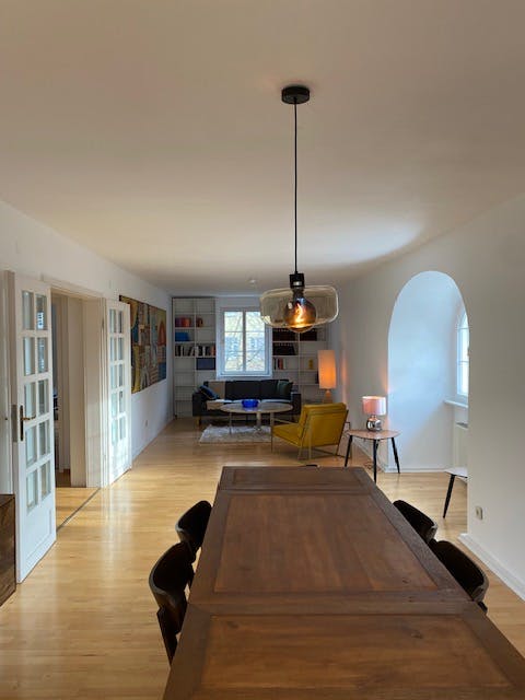 Charmante, ruhige 4- Zimmerwohnung in Pankow Entdecken Sie dieses geräumige und einladende 4-Zimmer-Loft im lebendigen Stadtteil Pankow, nahe dem Prenzlauer Berg. Die Wohnung verfügt über zwei komfortable Schlafzimmer – eines mit einem großen Doppelbett und das andere mit zwei gemütlichen Einzelbetten, die aber auch zusammengestellt werden können. Ein weiteres Highlight der Wohnung ist ein heller, weitläufiger Wohnbereich, der nahtlos mit dem Essbereich verbunden ist und sich perfekt zum Entspannen oder für gesellige Abende eignet. Ein weiteres Herzstück dieser Immobilie ist der zusätzliche vielseitige Raum, ideal zum Arbeiten oder Ausruhen, der Zugang zu einem schönen Balkon mit atemberaubendem Blick auf den üppigen Garten und die umliegenden Bäume bietet. Das Loft ist vollständig ausgestattet mit allem, was man für das tägliche Leben benötigt, einschließlich einer gut ausgestatteten Küche mit Mikrowelle und Grill, einer Waschmaschine, einem Bügeleisen und zuverlässigem WLAN. Das moderne Badezimmer ist mit einer Dusche und einer luxuriösen Badewanne sowie einer Toilette ausgestattet. Für zusätzlichen Komfort gibt es ein separates Gäste-WC. In einer ruhigen und dennoch hervorragend angebundenen Lage erwartet Sie Ihr neues Zuhause. Nur fünf Gehminuten trennen Sie vom S- und U-Bahnhof Pankow, von dem aus Sie in nur 12 Minuten die Friedrichstraße und in 16 Minuten den Alexanderplatz erreichen. Die Umgebung bietet alles, was das Herz begehrt: Bäckereien, eine traditionelle Metzgerei, einen Bio-Laden, Supermärkte und abwechslungsreiche Restaurants. Ein Einkaufszentrum und zwei idyllische Parks, die ideal zum Spazierengehen oder Joggen sind, liegen ebenfalls nur wenig entfernt. Erleben Sie in diesem wunderschönen Loft den perfekten Mix aus Komfort, Bequemlichkeit und dem besonderen Flair von Pankow und machen es zu ihrem neuen zu Hause....
