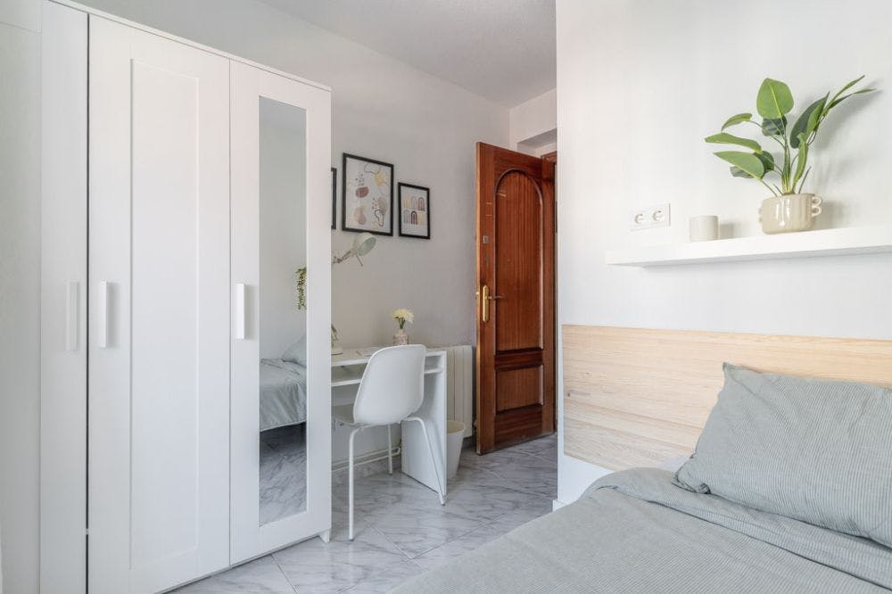 Charming flat in Hortaleza This apartment has 5 bedrooms and 2 bathrooms. It is located on the sixth floor and features a fully equipped kitchen with appliances (ceramic hob, refrigerator, oven, microwave) and utensils, as well as a dining area. It’s perfect for international students and young professionals, just a 5-minute walk from Hortaleza metro station, in a neighborhood known for its peaceful atmosphere and wide range of services and activities. A great opportunity to enjoy life in Madrid! This apartment is located in the Hortaleza neighborhood, a quiet and well-connected residential area in the north of Madrid. Just a few minutes’ walk from Hortaleza metro station (Line 4), it offers quick access to the city center and other key areas. The neighborhood is known for its relaxed, family-friendly atmosphere, with a wide variety of shops, supermarkets, bars, restaurants, and green spaces like Pinar del Rey park. It’s an excellent choice for students and young professionals seeking comfort, services, and quality of life in a safe and well-connected environment. The apartment enjoys excellent public transport connections, thanks to its location near various mobility options in the Hortaleza neighborhood. Just a 6-minute walk away is the *Hortaleza metro station* (Line 4), providing quick and direct access to key areas such as Avenida de América, Diego de León, and central Madrid. Additionally, on *Avenida de San Luis* and nearby streets like *Santa Virgilia* and *Carretera de Canillas* , there are several bus stops with lines such as *9, 72, 107,* and *125* , connecting to various parts of the city, including Chamartín, Plaza de Castilla, and Arturo Soria. As an added benefit, the *Bicimad* bike-sharing system is also available in the area. Just a few minutes’ walk away, there are stations where you can pick up a bike and move around the city in a healthy and sustainable way. With a monthly subscription of around €10, you can access more than 600 stations across Madrid. *Parque Pinar del Rey* This park is one of the green lungs of the Hortaleza neighborhood. Ideal for walking, exercising, or enjoying a picnic, it features wooded areas and sports facilities. It’s perfect for those who appreciate nature without leaving the city. *Centro Cultural Carril del Conde* Just a few minutes from the apartment, this cultural center is a key point for the artistic and social life of the neighborhood. It offers exhibitions, workshops, activities for all ages, and a public library. A vibrant place where the community comes together to learn and share. *Polideportivo Luis Aragonés* This large municipal sports complex has swimming pools, a gym, tennis courts, football fields, and more. It is very popular among locals and an excellent option to maintain an active lifestyle without leaving the area. *Mercado de Hortaleza* Located just minutes away, this neighborhood market offers fresh, local products in a friendly, traditional setting. Butcher shops, fishmongers, fruit stands, and gourmet stalls make it the perfect place for quality shopping with great service. *Parque Huerta de la Salud* A small hidden oasis between buildings, perfect for relaxing or taking a walk. Its trees, fountains, and benches invite you to disconnect, and its name recalls the area's agricultural history before urban expansion. - No smoking - No pets allowed - No parties - Trash must be taken out daily - Short-term visitors are allowed - (hidden) informs that in this apartment is installed a device that allows to control the noise level or decibels 24 hours a day, issuing an alert when the sound level exceeds the maximum allowed by the Community of Madrid, mainly between 23.00 and 6.00 hours. Bright room in Avenida San Luis Bright room located in Avenida San Luis in a shared apartment ideal for international students and young professionals. The room is equipped with everything you need to enjoy your stay, it has a *single bed (90cm)* , a large three-door closet with integrated mirror, ceiling fan, a desk with chair and lamp. The size of the room is *6.26 m2* , it has a high window overlooking the street, balcony, central heating and also has its own lock on the door for security. This room is located on the sixth floor of the building and the building has an elevator. For more details we invite you to see the floor plan and see the location of the room on the 6th floor. *Bed linen is not included, only the mattress cover is provided.* Please keep in mind that the amount requested in the "other additional costs" field refers to tenant assistance coverage....
