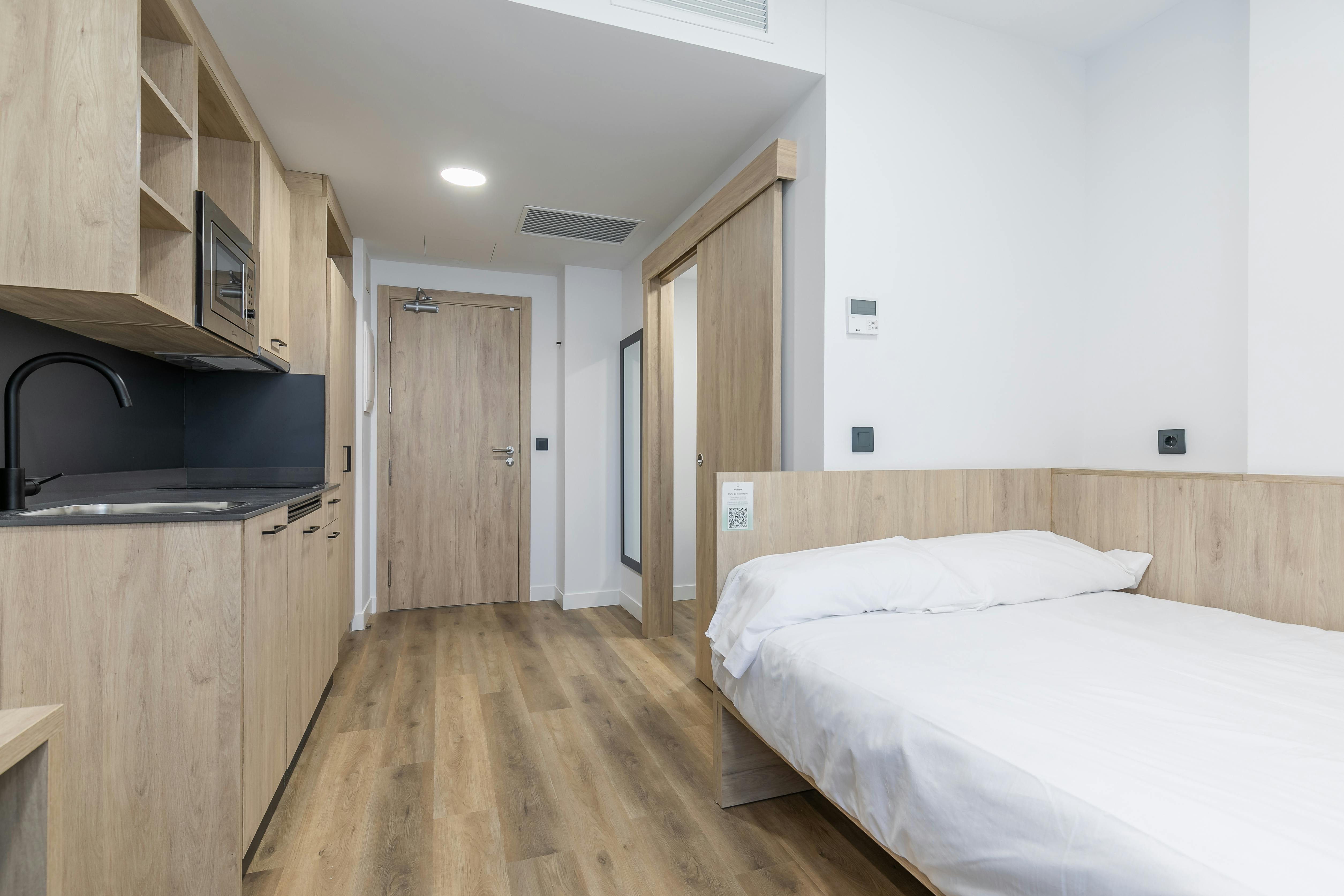 Lerne, arbeite, knüpfe Kontakte und fühle dich wie zu Hause.Entdecken Sie mehr Studentenwohnungen in Madrid🌟 You can use your uni promo code and get a special discount in HousingAnywhere Tenant Protection fee. Steps: - 'I have a promo code'' at the checkout, enter the promo code and hit ''apply'' - If it is legit, you will get it as cash back in 7-10 business days. 🔸Special discount for academic year bookings (9,5 or 10 months stays) Contact us in chat to apply for the discounted price! 🔸Cleaning room, change of sheets and towel included in the price. It is fortnightly. 🔸For the stays above 9 months, could be we charge a bit higher administration fee. Please inquire in the chat !! 💢💢💢 🏡Building, common areas and type of units More than a residence, a university neighbourhood in Madrid Norte. A campus with 11 buildings where you can enjoy all the facilities and meet students like you. This residence offers rooms and studios fully furnished. You will live in 1 residence, but you will have access to 11 common areas: - Swimming Pool: Relax and enjoy leisure time by the swimming pool. - Gym: Stay active with a fully equipped fitness center. - Entertainment Room: A dedicated space to unwind and socialize - Social Hub: Connect with fellow residents in a communal gathering space. - Study Room: Quiet study spaces for focused academic pursuits. - Swimming Pool: Relax and enjoy leisure time by the swimming pool. - Laundry Room: Convenient on-site laundry facilities. - Restaurant: On-site dining options for added convenience. - Dining areas: areas with oven, microwave, vending machines, and space to eat (No stoves for cooking, no fridge, no common kitchenware. You need you bring your own kitchenware) - Terrace: Outdoor terrace space to enjoy fresh air and city views. - Parking: Secure parking facilities for residents. 📍Location and Neighborhood The residence is located in the north of Madrid, in the Fuencarral neighborhood and offers modern and comfortable accommodation for university students looking for a unique experience during their stay in the city. In a quiet and well-communicated area to enjoy the full experience as a student. Whether you come to Madrid to study a university degree, a master's degree or a specialisation course, here you will find an environment designed to make you feel at home from the very first day. STUDIO ROOM WITH PRIVATE BATHROOM AND KITCHEN In-Room Features: Large closets, desks, and air conditioning for added comfort. This room does not contain a TV screen. Immerse yourself in a supportive community, enjoy top-notch facilities, and experience the best of Madrid. Welcome to a space where convenience, comfort, and community converge for an enriching student experience. 💢💢💢 🔸City registration is possible for stay of more than 6 months. 🔸After the reservation is completed, you will be required to pay the deposit and other fees through our secure payment system....