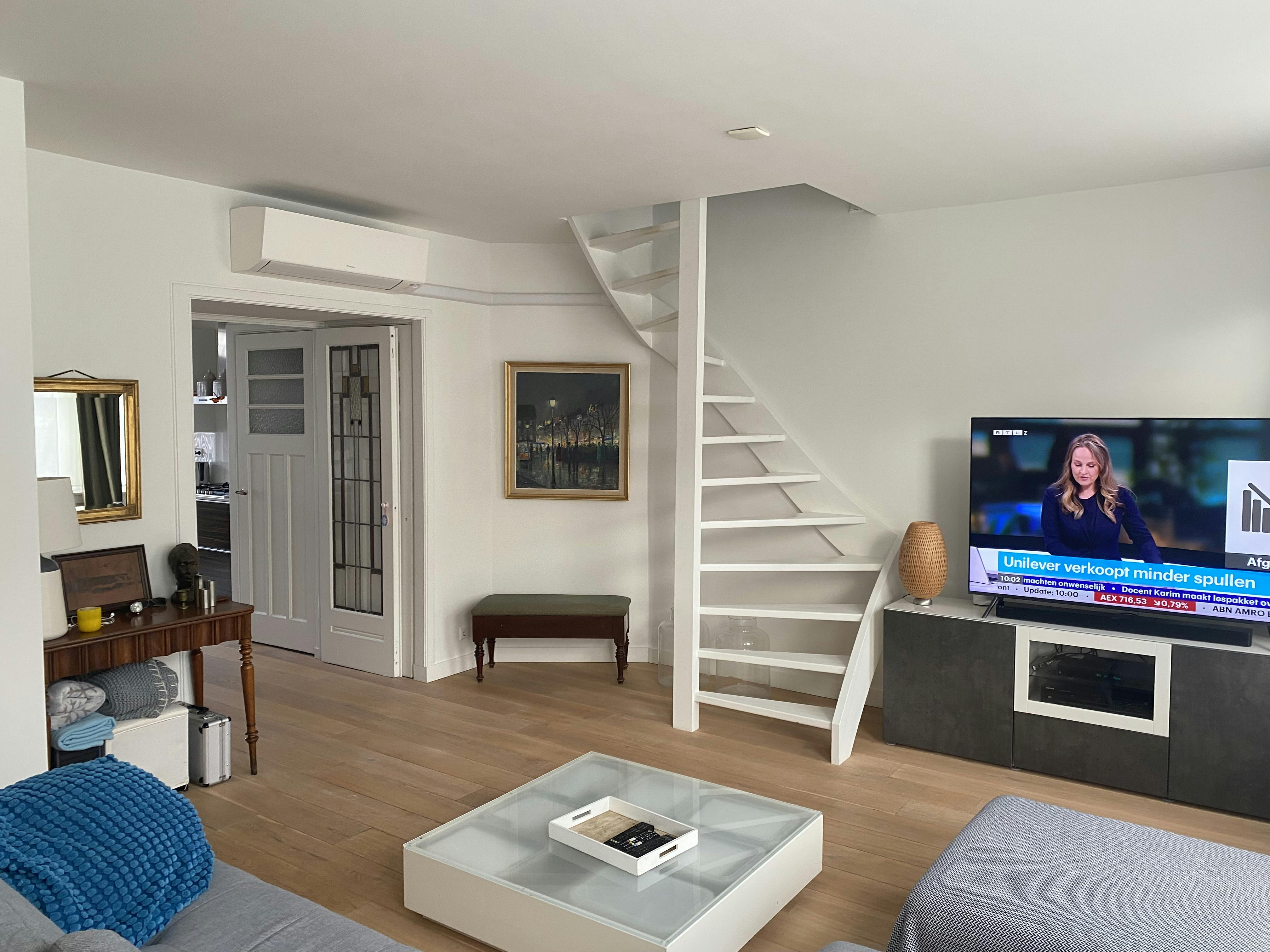 Beautiful apartment on 2 floors with fully equipped kitchen large living room with flatscreen tv with fast Internet and a bathroom with bathtub and separate shower and a roof terrace. No registration possible. Central heating Gas cooking Fully equipped kitchen Office space for remote working Washer and dryer available in the apt 1 bedroom 1 bathroom 1 toilet Roof terrace AC in living room and bedroom Supermarkt and public transport all within 3 min walk. ...