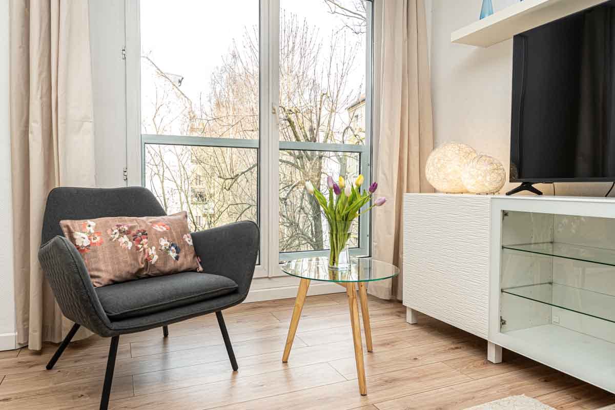 Wunderschöne,moderne und sehr sonnige 2 Zimmer Wohnung im angesagten Prenzlauer Berg.Perfekt ausgestattet:Schlafzimmer mit Doppelbett/Schrankwände ( sehr ruhig), Wohnbereich mit Esstisch/Stühle, gemütliche Sitzecke, Flur mit zusätzlichem Schrank, offene Küche mit Waschmaschine, Trockner, Spülmaschine, Kühl/Gefrierschrank, Geschirr, alle Kochutensilien. Bad mit Wanne und Glasduschwand, Ablagen, Fön, Handtücher, Bettdecken, Putzmittel/Putzgeräte,etc. Pauschalmiete inklusive WLAN, Reinigung ein Mal im Monat, GEZ, Concierge Service. Nur Strom wird extra nach persönlichem Verbrauch berechnet und die Kosten hierfür sind daher variabel. Keine Haustiere. Perfekte Lage im angesagten Szene-Bezirk Prenzlauer Berg. Um die Ecke liegt der Kollwitzplatz, die Kastanienallee, der Wasserturm, die Kulturbrauerei und der Mauerpark. Nur 5 Gehminuten ist es bis zur U-Bahn Eberswalder Straße. Von hier gelangen Sie schnell zum Alexanderplatz, in den Westen oder wo immer Sie hinwollen. Restaurants aller Nationalitäten befinden sich in der nahen Umgebung. Ein Lebensmittelgeschäft (REWE) ist genau gegenüber in der Kulturbrauerei, weitere Geschäfte des täglichen Bedarfs wie Bäcker, Metzger, Reinigung, Apotheke .etc sind fußläufig zu erreichen. Great modern, very sunny and bright flat in the very popular Prenzlauer Berg area. Perfectly equipped: Bedroom with double bed, wall units. Living area with dining table/chairs, cosy sitting area, hallway with another cupboard, open kitchen with washing machine, dryer, dishwasher, fridge/freezer, crockery, all cooking utensils. Bathroom with bathtub and glass shower screen, shelves, hairdryer, towels, duvets, cleaning products/utensils,etc. All-inclusive rent including WLAN, cleaning once a month, GEZ, concierge service. Only electricity is charged extra according to personal consumption. These costs are therefore variable. No pets. Perfect location in the trendy Prenzlauer Berg district. Around the corner is the Kollwitzplatz, the Kastanienallee, the Wasserturm, the Kulturbrauerei and the famous Mauerpark. It is only a 5 minute walk to the underground station Eberswalder Strasse. From here you can quickly get to the Alexanderplatz and the west of Berlin or to all other directions. Restaurants of all Nations are around. A Supermarket REWE is right across the street in the Kulturbrauerei, other shops for daily need as butcher, baker, dry cleaner or pharmacy are within walking distance....