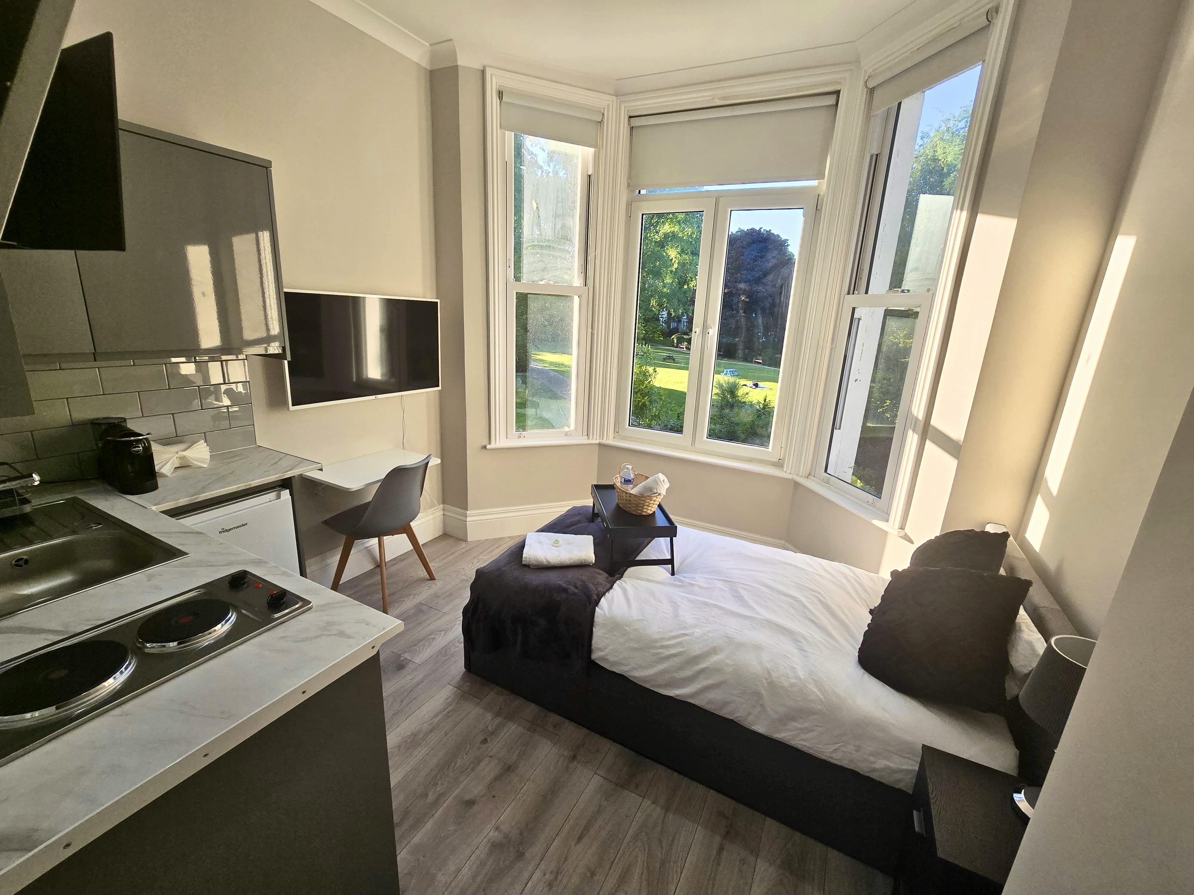 GARDEN-VIEW STUDIO 🐿️🌞 CONTACT ME DIRECTLY FOR DISCOUNTS: the longer you stay, the less you pay! 🚇 3min walk to Earl’s Court tube station 🛜 Super-Fast Wi-Fi 🌻 Expansive Windows, Fresh Daylight & Garden View 🧑🧑🧒 Welcoming Neighbourhood Designed for solo travellers seeking affordable accommodation in the upscale city of London. This all-in-one studio flat offers everything you need for your solo trip away in the city, surrounded by high street bakeries, Victorian pubs and bars with a grocery superstore around the corner. Bathroom: LED Mirror Cabinet (please note photos were taken before we installed this) Sink Small Shower Toilet Kitchen: Combi Microwave/Oven Stove Refrigerator and small freezer Coffee Machine Toaster Kettle Main Space: Single Size Bed (90cm wide and 190cm long) Single Wardrobe TV Coffee table The space Please Note: This apartment is located within a residential apartment complex building, which is undergoing cosmetic renovation works in the common areas, specifically the stairs leading up to the apartment and entryway. The apartment internally remains unaffected and as shown exactly in the photos, but you will encounter construction-related impacts in the common areas of the building. This may include: * Dust in hallways and stairs * Exposed wiring and unfinished surfaces * Construction nois...