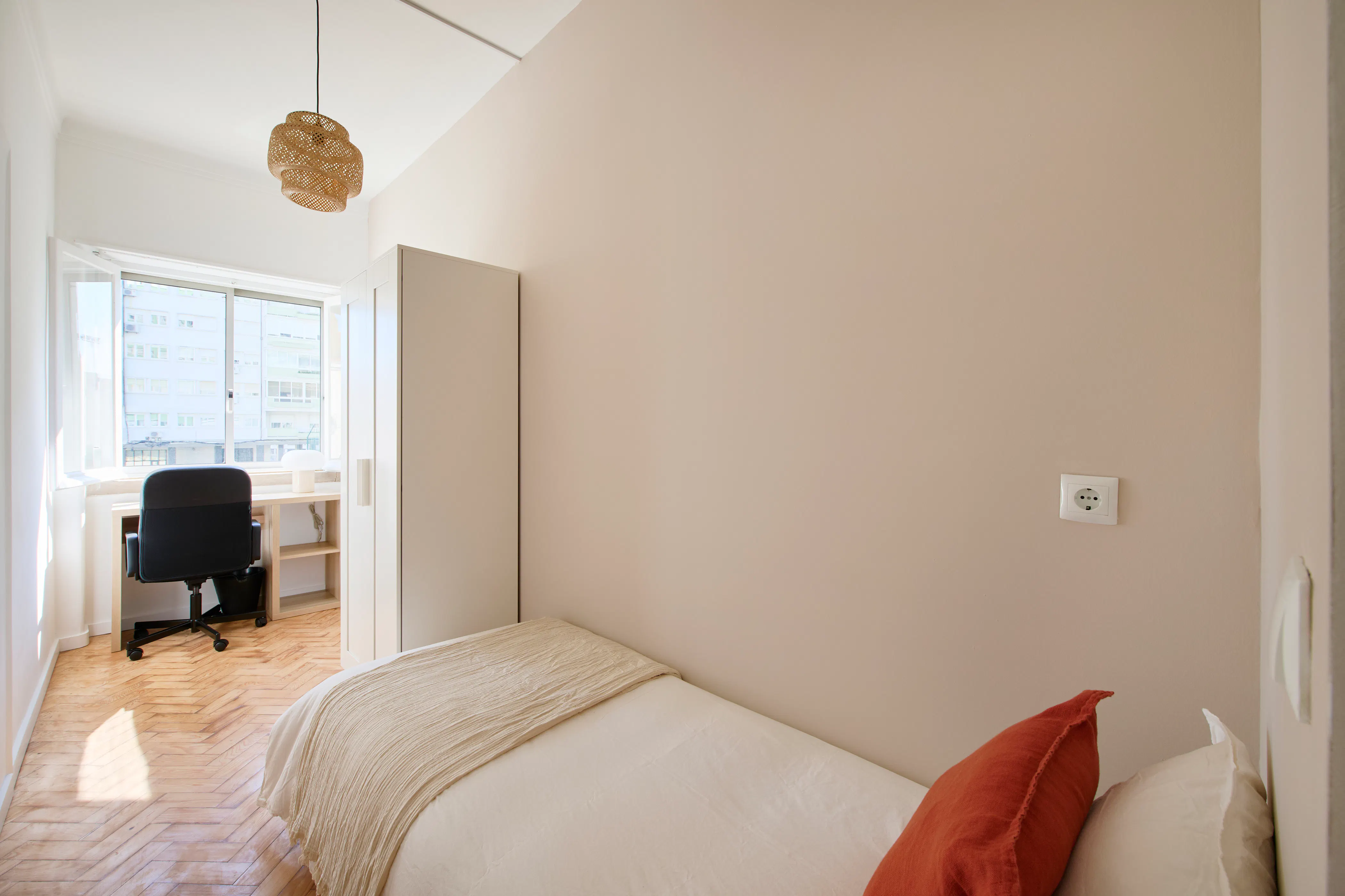 🌟 Bright and Professional Room in the Heart of Alvalade! 🏠 Apartment This expansive 10-bedroom apartment is perfectly equipped for a communal yet organized lifestyle in Lisbon. The shared kitchen is fully functional with an oven, microwave, and washing machine, making daily chores effortless. With two modern bathrooms featuring walk-in showers, the flat ensures a smooth routine for all residents. High-speed internet and a welcoming atmosphere make this an ideal base for your Lisbon adventure. 🛏️ Room The bedroom is a cozy and private retreat designed for both rest and productivity. It features a comfortable bed, a spacious closet for your wardrobe, and a dedicated workspace with a desk and an ergonomic office chair. Large windows allow for plenty of natural light, creating a bright and inspiring environment for studying or working from home. 📍 Neighborhood Located on the prestigious Av. EUA, you are situated in one of Lisbon’s most sought-after residential districts. You are a 12-minute walk from the Roma-Areeiro train station and a short stroll to the Alvalade Metro station, providing easy access to the entire city. The area is famous for its traditional bakeries, local markets, and proximity to University City, offering a perfect balance of local charm and urban convenience. ✨ Extra information To ensure a smooth and transparent stay, please keep the following residency conditions in mind: - Utility Cap: Monthly bills are included in your rent up to a limit of 35€ per tenant. - Cleaning Services: Professional cleaning is included in the rent price to maintain the common areas. -Security Deposit: The deposit is handled directly with the advertiser and can be settled via bank transfer or cash during your check-in. - Termination Policy: To be eligible for a deposit refund upon early departure, a minimum of one-third of the total contract stay must be completed. - Room Dimensions: Please note that all provided room sizes are indicative and intended for guidance purposes...