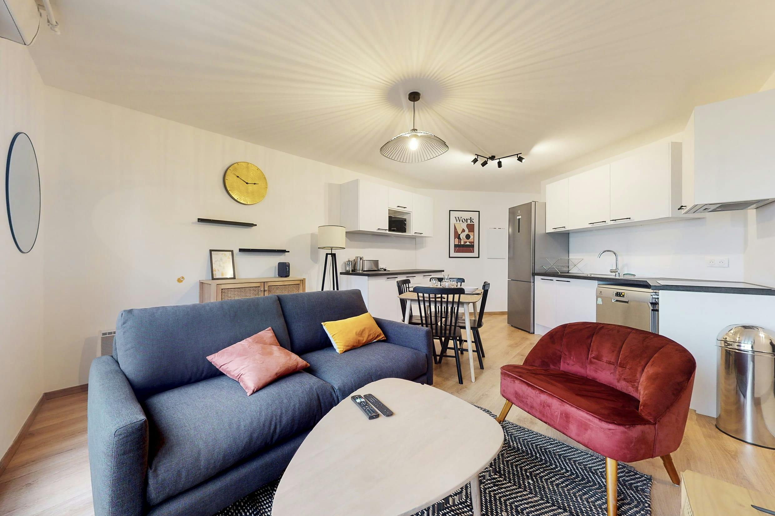 Découvrez cette charmante chambre privée située dans la résidence Bezons Henri Hervé, un espace récemment rénové au style contemporain qui allie confort et modernité. Parfaitement conçue pour une personne, cette chambre spacieuse vous offre un véritable havre de paix, idéal pour étudier, se détendre ou travailler à distance. Meublée avec soin, la chambre dispose d’un lit double de haute qualité (140x200cm), d’une grande armoire pour le rangement, d’un espace bureau dédié et d’une table de nuit. La literie haut de gamme assure un sommeil réparateur, tandis que l’espace bureau vous permet de vous concentrer efficacement lors de vos études ou télétravail. La résidence propose un cadre convivial avec un grand salon lumineux, équipé d’un canapé confortable, d’une smart TV, d’une grande table, ainsi que d’une cuisine entièrement équipée, idéale pour partager des repas ou organiser des moments conviviaux. Vous aurez également accès à une salle de bain partagée moderne, équipée d’une douche, d’un lavabo et de toilettes. Située à proximité immédiate des commerces (supermarchés à 1 minute) et des restaurants (2 minutes), la résidence bénéficie d’un accès pratique aux transports en commun : à seulement 2 minutes du tram Pont de Bezons (ligne T2) et à 1 minute de l’arrêt Jaurès Branchard (bus 272). Vivez dans un environnement chaleureux et dynamique, où tout est pensé pour votre confort. Réservez dès maintenant votre chambre en ligne et rejoignez un cadre de vie idéal pour étudiants ou jeunes professionnels...
