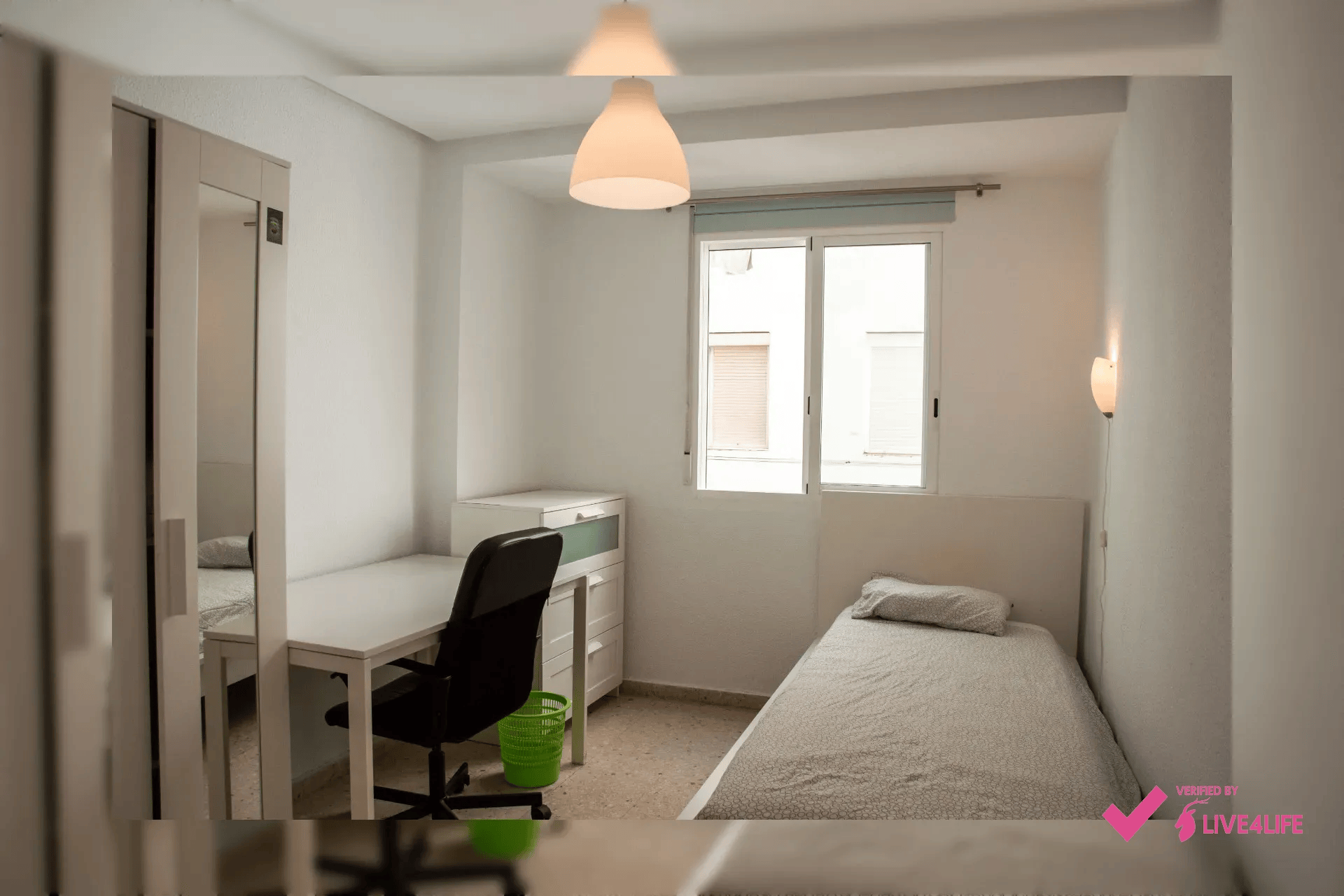 Esta Habitacion se encuentra en Avinguda de Valladolid, 40 Piso 4 (Valencia). Es un dormitorio luminoso y amueblado, dispone de 5 habitaciones y 2 baños. Se trata de un inmueble exterior. Dispone de balcón, cocina equipada y en muy buena zona....