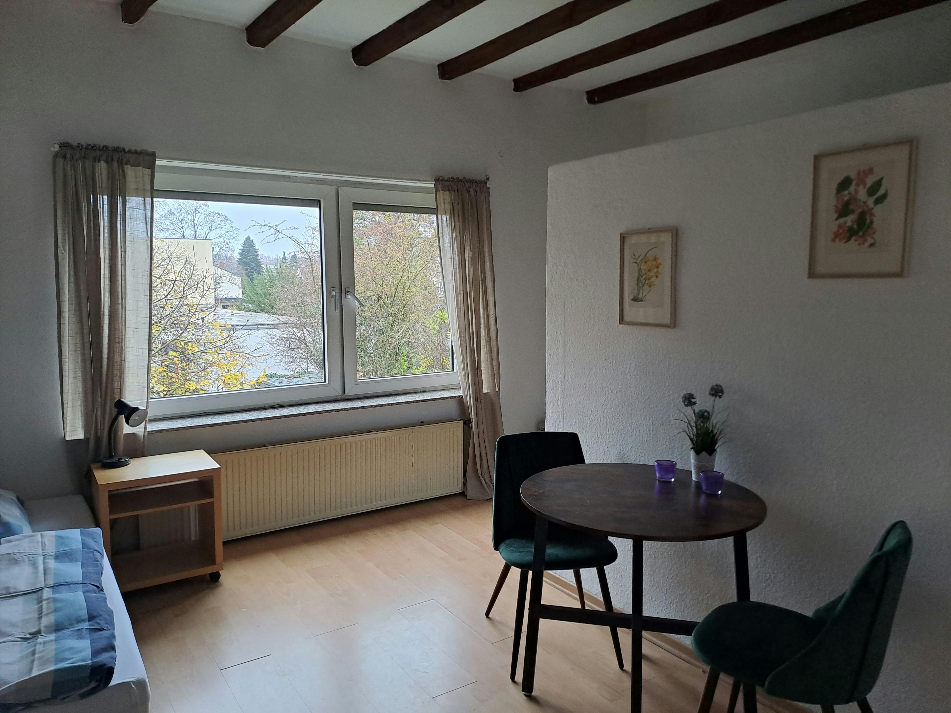 A charming, small, and newly renovated one-room apartment with approximately 20m2 of living space near the Rhine River. The apartment consists of a charming living room and bedroom with a large window overlooking the garden, providing plenty of natural light. Equipped with a small, functional kitchenette with a stovetop, refrigerator, and sink, as well as all the necessary kitchen utensils for daily needs. Free Wi-Fi is available. The room has just been renovated, and the separate bathroom has been completely renovated. Our house is located on a quiet residential street in Bad Godesberg near the Rhine River. All amenities for daily needs, such as supermarkets, bakeries, pharmacies, and restaurants, are within walking distance. Excellent public transport connections and quick access to the motorway are also within easy and quick reach. The Federal District is also easily and quickly accessible from us...