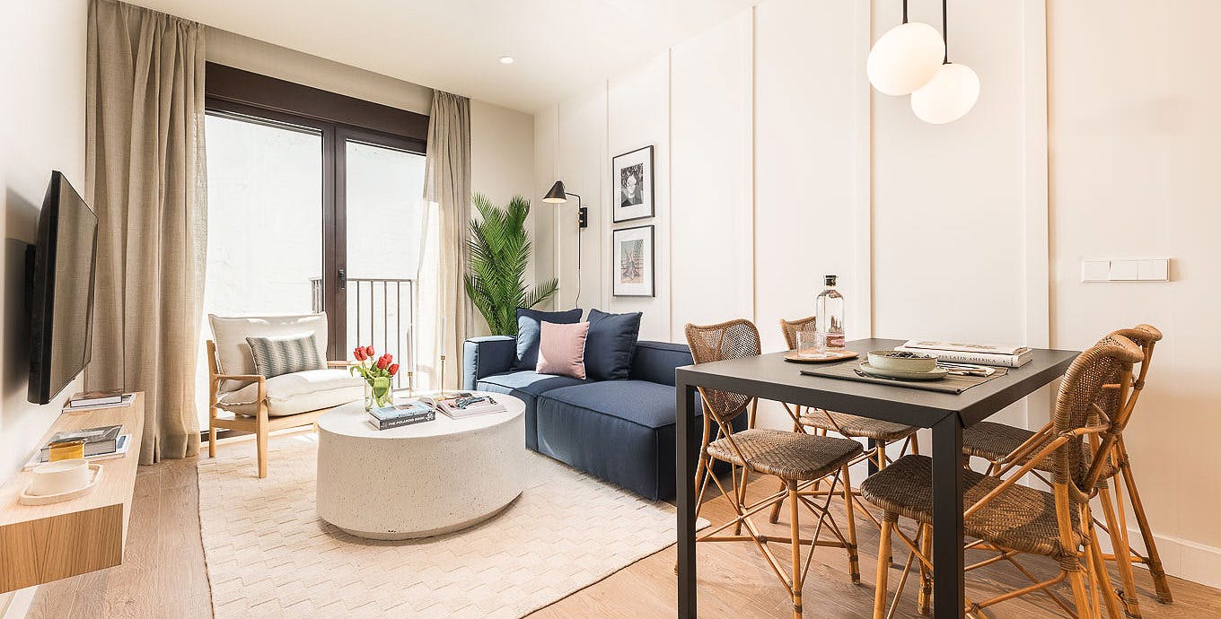 Promos by length of stay in the final price: -Booking + 4 months: 5% discount -Booking + 9 months: 7,5% discount -Booking + 12 months: 10% discount Please contact us to apply for the discount in your booking request! - Utilities included in the price up to 120€ - 180€ depending of the apartment. - Some apartments pets are allow by request. There is an extra charge for pets. Please contact us to know the supplement and availability! -- This modern apartment is part of the Living Farmacia building, a sustainable residential complex that offers a new way of life. The common spaces are designed to enjoy and create community with neighbors, promoting a social and collaborative environment. Additionally, it provides access to a variety of shared services and amenities that enrich the everyday living experience. This newly renovated apartment, located on the second floor of the building, stands out for its natural light flowing through the windows overlooking the common courtyard. Every detail has been meticulously selected to create a cozy and elegant atmosphere, using high-quality materials and exceptional finishes. This home offers a perfect balance between style and functionality, inviting you to enjoy a space of calm and comfort in the heart of the city. The neighborhood of Malasaña stands out for its vibrant cultural life. Its cobblestone streets are dotted with historic buildings where modernity blends with history, and traditional bars coexist with avant-garde design shops and fashionable restaurants. Around Farmacia Street, there are numerous points of interest, such as Plaza del Dos de Mayo, a lively spot where locals gather to enjoy outdoor cafes and cultural events. Additionally, the San Ildefonso Market offers a wide range of gastronomic options in a lively atmosphere. The proximity to Fuencarral Street is also ideal for shopping enthusiasts, with its boutiques and unique stores known for their alternative fashion and avant-garde design. General Info This 42m2 exterior apartment is located on the second floor and can accommodate up to two people Living / Dining Area The open-plan living room features a two-seater sofa, a coffee table, an armchair, and a Smart TV. It also has a large window that provides access to the balcony. The dining area has a table and chairs for four people. Kitchen The open kitchen is fully equipped with utensils and small appliances (toaster, kettle, juicer, coffee maker, vacuum cleaner), as well as a dishwasher, microwave, and oven Bedrooms The master bedroom is equipped with a double bed (1.80m x 2.00m), two bedside tables, built-in wardrobes, and en suite bathroom. Bathroom The apartment has a fully equipped bathroom with a shower. Additional Info The building features several common areas, including a patio with a chill-out zone and seating area. Additionally, the building is equipped with an elevator. The apartment has air conditioning and central heating via ducts. Parking service is available on demand, at an additional cost...