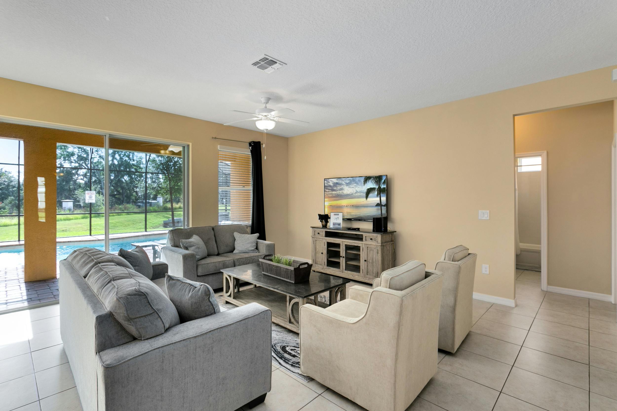 Welcome to our beautiful villa situated in Veranda Palms, only 3 minutes away from West Irlo Bronson Memorial Highway. Our home boasts stunning scenery, tranquil surroundings, and a breathtaking lake view. Veranda Palms is ideal for a family vacation. It is located right next to a nature reserve, with excellent trails and beautiful scenery. There are several supermarkets about 5 minutes away, which include Sam's Club, Publix and Target etc... A good meal can be enjoyed at one of the many restaurants that are in the same area. Veranda Palms is also ideally located for attractions and activities. By car you can reach Disney's Magic Kingdom, Animal Kingdom, Typhoon Lagoon, Epcot, Universal Studios and much more in 15-20 minutes. By driving 1.5 hours to St.Petersburg, you can experience the most amazing beaches Florida has to offer, and in Tampa you can also find Busch Gardens. Kennedy Space Center is about 1 hour drive from the villa, our home has many modern conveniences to ensure a comfortable stay. The villa has also been professionally decorated to give an executive feel throughout. With two floors, 8 bedrooms and 7 baths, your family will be able to enjoy spending time together, but also obtain privacy when needed. . The living room: The villa has an open living room and kitchen. The lounge area has a comfortable sofa.The living room is delicately decorated, and allows for quality time. Free WI-FI and cable are available for our guests as well Kitchen: Here you will find all modern appliances, stove, built-in microwave, dishwasher and a large double fridge with freezer and ice maker. You will also find coffee maker, blender, mixer, kettle, toaster, pots and pans and all kitchen utensils so you can make your own dinner. Complete tableware for 16 people, and much more. Dining table with 6 chairs, light design, and 3 bar stools where you can enjoy a good meal or morning coffee. BEDROOMS 1ST FLOOR: Bedroom 1: 1 King Bed (Private Bath) Bedroom 2: 1 Queen Bed Bedroom 3: 2 Full Beds Hallway Bathroom between the Queen and Full bedroom BEDROOMS ON 2ND FLOOR: Bedroom 4: 1 King Bed (Private Bath) Bedroom 5: 1 King Bed (Private Bath) Bedroom 6: 1 King Bed (Private Bath) Bedroom 7: 1 King Bed (Private Bath) Bedroom 8: 2 Twin Beds (Private Bath) Pool: After long hours in parks and shopping centers, it is wonderful to come back to your own private South East facing pool area. As you aren’t overlooked in the back, you can thoroughly enjoy dining al fresco or drinks by the pool side. Here you can relax in the sun on one of the 4 loungers, or take a refreshing swim in the lovely pool. The villa is equipped with extra large pool area. The terrace is partially covered so you can pull into the shade during the hottest parts of the day. The pool is surrounded by netting to protect against bugs and UV rays. Pool area features: -lake view -4 loungers -pool heat is available at an additional cost. Important notice for Garage: Motor vehicles / trailers / heavy objects are prohibited in this garage. The garage floor in this property has been painted and sealed . It’s sole purpose is for guests to use it for a games room only. The floor is not strong enough to take the weight of any type of motor vehicle / trailer or heavy objects. - COMMUNITY CLUB HOUSE - • 3 minute walk from home or quick drive • Heated community pool, hot tub & kids splash pad • Beautiful furnishings inside and outside • Fitness center • Showers, changing rooms & restrooms Parking Rules for the Community: Vehicles must be parked in the driveway or in the garage. Driveway only fit 2 cars. Vehicles parked in the street, blocking the sidewalk, or on the grass are at risk of being towed at your own expense. Overnight parking in the clubhouse is not allowed. No parking in front of the dumpster. All commercial vehicles, recreational vehicles, trailers, self-propelled motorhomes, motorcycles, and boats shall be parked in enclosed garages at all times. Additionally, please do not park in front of fire hydrants. It will be necessary for emergency personnel to have access to this in the event of an emergency. Vehicles blocking fire hydrants are at high risk of being towed, at your expense....