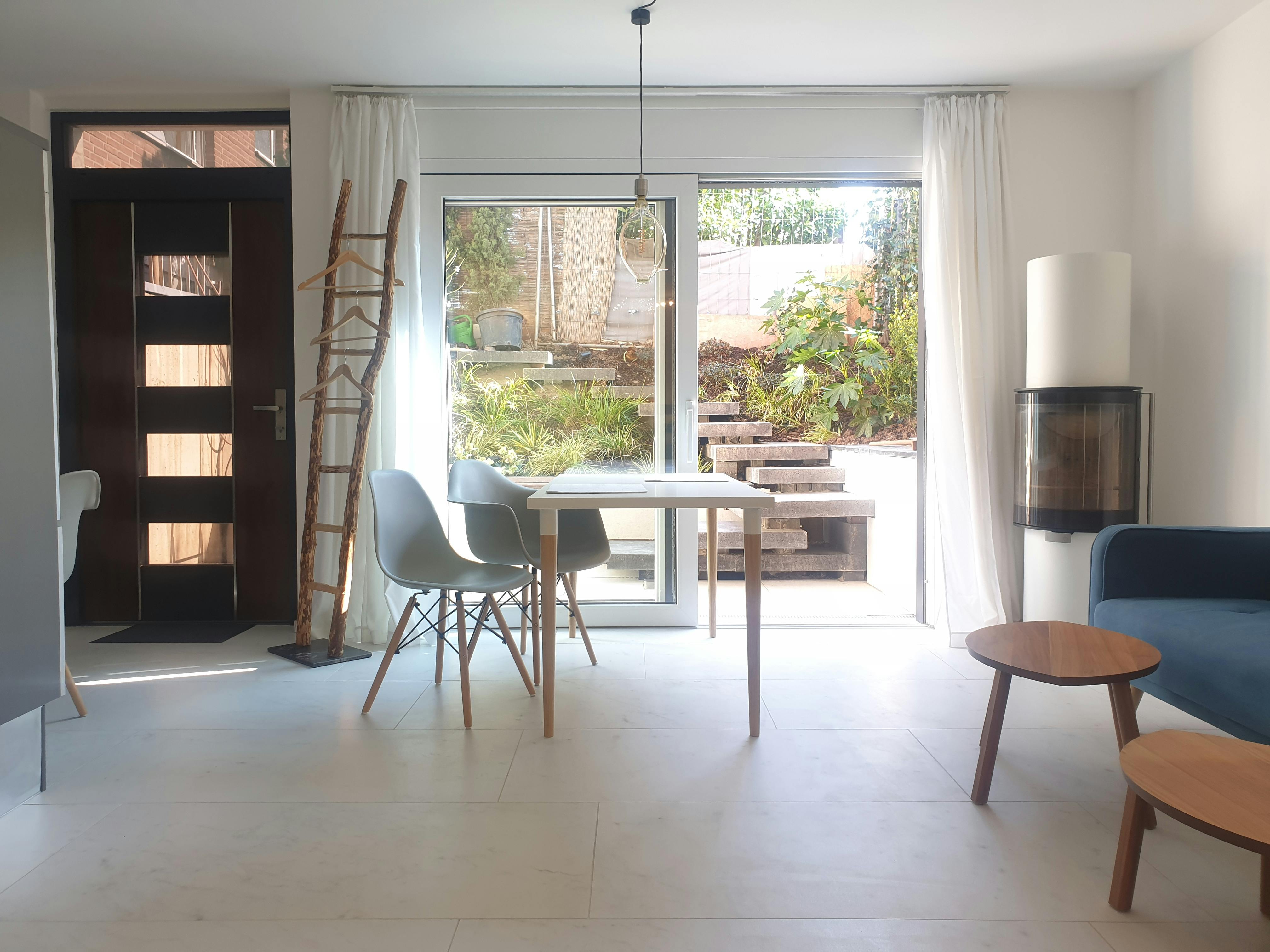 Ein Juwel: Absolut ruhig, aber dennoch zentral gelegene 2,5- Zimmer-Wohnung. Der eigene Eingang ist über den Garten zu erreichen. Es handelt sich um ein Nichtraucher-Apartment. Die Belegung ist auf 2 Personen beschränkt. Die zum Wohn- und Essbereich offene Designer-Küche ist komplett ausgestattet u.a. mit Spülmaschine Mikrowelle, Kaffeemaschine. Im eigenem Wasch-/Stauraum steht die Waschmaschine zur Verfügung. Über den Hintereingang ist der Trockenraum zu erreichen. Die Sonnenterrasse liegt vor dem geräumigen Wohnzimmer. Hier steht auch ein Arbeitsplatz zur Verfügung. Das Badezimmer ist luxuriös ausgestattet. Die Fliesen stammen aus der Produktion der Fliesen in der Metro in Paris. Die Wohnung befindet sich in beliebter Wohnlage in Neuss-Reuschenberg direkt am Park, der zu den Erft-Auen führt. In unmittelbarer Umgebung der Immobilie fahren einige Buslinien. Zu Fuß erreichen Sie verschiedene Ärzte, Physiotherapeuten, Restaurants, Bäckereien, Supermärkte und ein Café. Außerdem gibt es einige Fitnessstudios, Modegeschäfte und Apotheke. Das Haus liegt 2 km von der A 57 entfernt, öffentl. Parklätze liegen vor dem Haus, Die Haltestellen für Busse zum Bahnhof Neuss-Süd + Hbf Neuss+Düsseldorf sind in ein paar Schritten zu erreichen. Taxistand gegenüber. Die Königsallee ist in 15 Min. zu erreichen, der Düsseldorfer Flughafen liegt 12 km entfernt. Eine Wohnungsgeberbestätigung kann erst ab der Mietzeit von 4 Monaten gegeben werden. Eine Saunalandschaft mit Schwimmbad WellNeuss ist ca. 1 km entfernt. Das Haus liegt am Eingang eines Parks, der in die Erft-Auen übergeht. Wer gerne joggt und Grün genießen will, ist hier richtig. Auf die Annehmlichkeiten einer Stadt muss man trotzdem nicht verzichten. In einem Umkreis von 50 Metern befinden sich alle Einkaufsmöglichkeiten und Gaststätten. Gegenüber hat ein Fitnesscenter gerade neu geöffnet und bietet auch Tageskarten an. Ein paar Häuser weiter können Sie zu Fuß eine entspannende Thai-Massage erreichen. Nur 1 km entfernt befindet sich eine riesige, sehr gepflegte Saunalandschaft und ein Hallenbad....