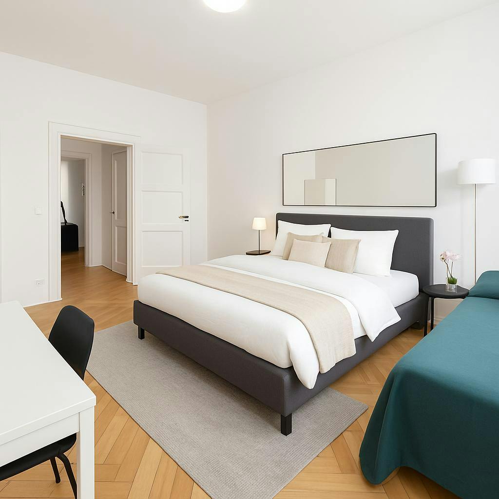 Room Description This welcoming private room on Schleißheimer Straße in Munich spans 15 m2 and is designed with comfort and convenience in mind. The room features a cozy bed, a spacious wardrobe, and a desk suitable for studying or working. The apartment itself is a generous 110 m2, offering plenty of space for shared living. Modern amenities include central heating and high-speed internet, ensuring a pleasant living experience year-round. Common Areas The apartment includes a shared bathroom and a separate toilet, both well-maintained. The kitchen is fully equipped with essential appliances such as a stove, oven, refrigerator, and microwave, making meal preparation straightforward. Additionally, a washing machine is available for communal use, adding to the convenience of daily living. Neighborhood Schleißheimer Straße is located in the lively Neuhausen-Nymphenburg district of Munich. This area combines historic charm with modern amenities. Neuhausen is known for its attractive architecture and the nearby Nymphenburg Palace, an impressive baroque palace with expansive gardens. The neighborhood offers a vibrant atmosphere with a variety of local shops, cafes, and restaurants. Public transportation is easily accessible, with bus and tram lines providing convenient connections to Munich's city center and other parts of the city. Neuhausen-Nymphenburg is a culturally rich and family-friendly area, making it an excellent choice for a dynamic yet comfortable living environment....