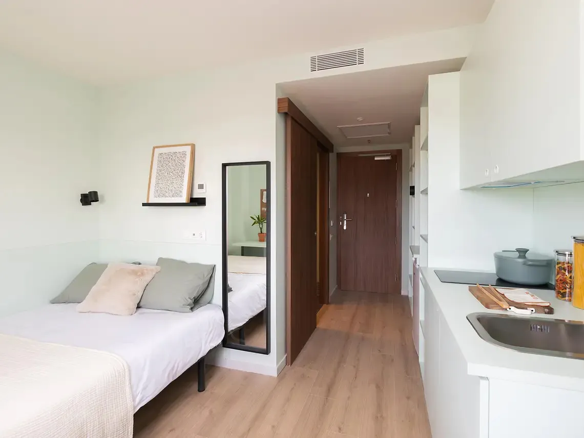 Studiare, lavorare, fare nuove conoscenze e sentirsi a casa.Esplora le altre residenze per studenti a Barcellona🔸Cleaning room, change of sheets and towel included in the price. 🔸Deposit: Semester is 400€ and Academic is 700€ 🔸 All-inclusive living means you’ll enjoy high-speed internet, water, heating, air conditioning, 24h security, and unlimited access to all common areas such as the gym, study rooms, games lounge, and more — all covered in your rent! 🌐💡🏋️♂️📚 🛏️ Your Studio Enjoy up to 21.47 m2 of fully furnished comfort. This spacious room features a 135x200 cm double bed, a study area with a desk, chair, and lamp, and a kitchen equipped with a microwave, fridge, sink, and extractor fan. The ensuite bathroom 🚿 includes a shower and extra storage, along with a large wardrobe and mirror for added convenience. 🏡 Residence & Living Experience This residence offers modern, fully furnished rooms and studios with private kitchen. Our categories are designed to provide students with a comfortable and independent living experience. Designed for ultimate comfort and ease, the building features outstanding amenities including a pool, fully equipped gym, study zones, coworking spaces, a dining room, laundry or terrace 📍 Location & Neighborhood Just a short walk from the Autonomous University of Barcelona (UAB) – Campus Bellaterra and a 29-minute bus ride to ESADE – Sant Cugat, Alba Viu offers the perfect mix of comfort, community, and convenience. With a bus stop right in front and easy train access to Barcelona 🚍🚆, getting around is simple. We're also near the ALBA Synchrotron — ideal for students and researchers. ❗ After the reservation is completed, you will be required to pay the deposit and other fees through our secure payment system...