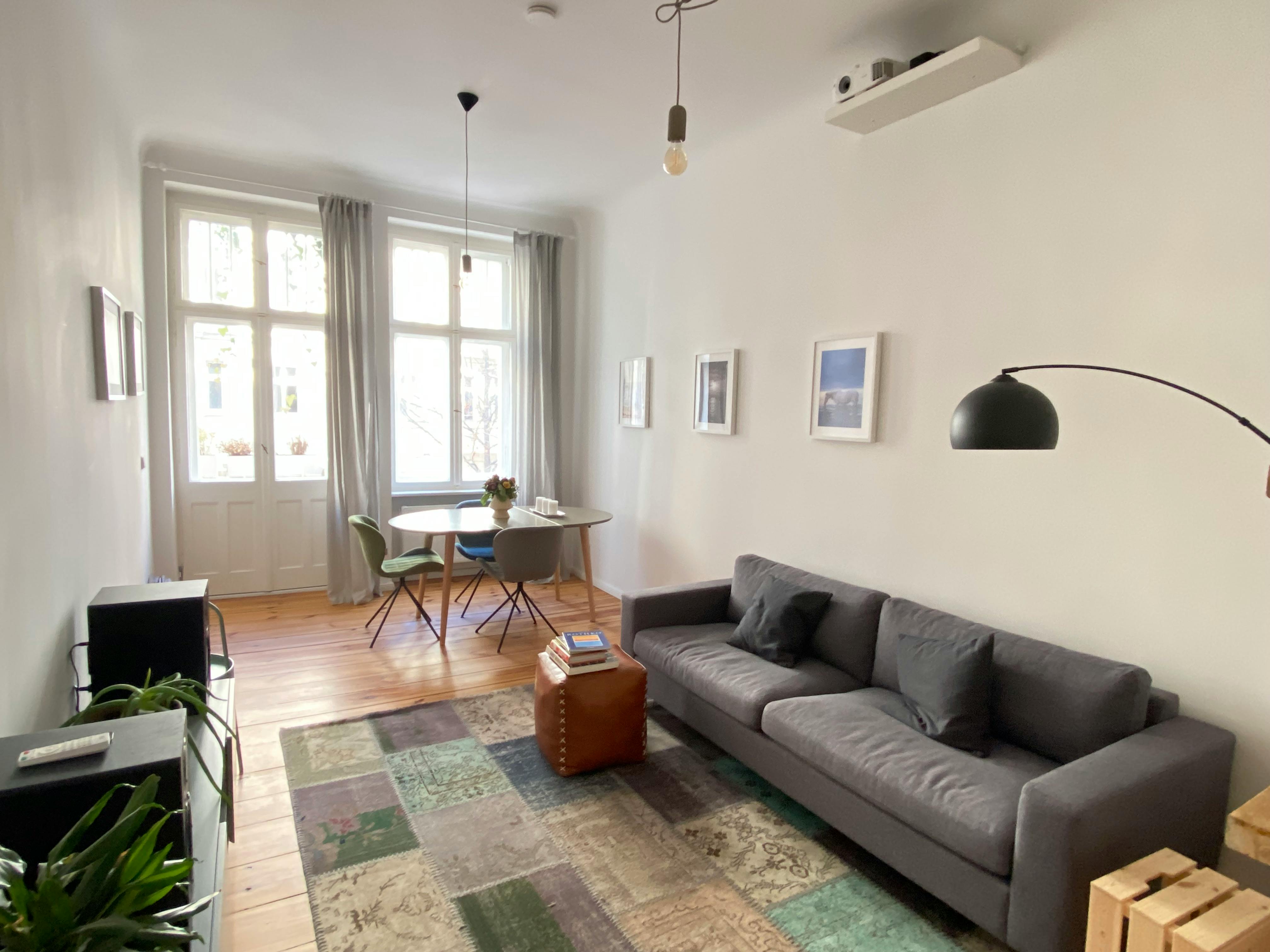 Stilvolle 1-Zimmer-Wohnung mit Balkon im ersten Stock, in zentraler Lage zwischen dem Boxhagener Platz und dem RAW-Gelände. Die Wohnung befindet sich in einer ruhigen Straße, aber nur ein paar Schritte entfernt von den besten Cafés, Restaurants und Brunch Locations. Die Wohnung selbst hat einige nette Design-Akzente, fühlt sich aber immer noch sehr gemütlich an. Die Küche hat eine gemütliche Holzecke und bekommt die ganze Morgensonne. Ruhiges Schlafzimmer mit Blick auf den Hinterhof. Toller Projektor zum Filme schauen :)...