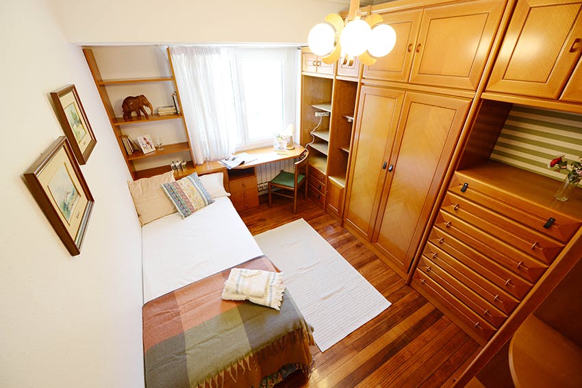 HABITACION INDIVIDUAL Mucha luz y buenas vistas en zona muy tranquila, rodeada de monte y bien comunicada. Cuenta con cama individual de 0,90x1,90 con otra debajo para visitas. Amplio almacenaje y zona de estudio. CARACTERÍSTICAS – 70m2 | 3 habitaciones. – 2 habitaciones individuales con cama de 0,90×1,90m. y otra debajo para visitas – 1 habitacion individuale. doble con cama de 1,35×1,90m. y mirador – Actualizado ZONAS COMUNES – Sala amplia con TV, butacas y sofá. – Cocina equipada con zona de comedor. – 1 baño con mampara. DESCRIPCIÓN DEL PISO Piso tradicional con un baño y cocina actualizados y vistas espectaculares. Una gran zona común de salón, cocina y comedor. Lo más destacable es el amplio salón y las vistas desde cualquier habitación y desde la terraza común. Este piso tiene 3 habitaciones (una de ellas doble con mirador privado), cocina con comedor , salón y un baño completo con mampara. Suelo de mandera y calefacción y agua caliente de gas individual. Es un quinto piso con ascensor y todo exterior. UBICACION Y COMUNICACIONES Está situado en Uríbarri, un barrio tranquilo y vecinal con empinadas cuestas que se salvan con escaleras mecánicas. Está bastante cerca del Ayuntamiento . La línea 3 del metro queda cerca y hay una parada de bus en la misma calle que te lleva al centro. Cuando hayas tenido suficiente de la vida del vecindario, cruza el puente Zubizuri y te encontrarás en el corazón del centro de la ciudad. Andando se llega al centro en 10 minutos y si te gusta pasear o correr puedes acercarte al Paseo de la Memoria y bordear la Ría. Puedes llegar andando al Guggenheim en unos 15 minutos cruzando el puente La Salve que se hizo famoso cuando el museo Guggenheim se construyó directamente debajo de él. El pórtico rojo del puente se construyó más tarde en 2006 para integrar aún más la arquitectura del puente con el Guggenheim. ¡Arquitectónico! Muy bien comunicado con las universidades y con todo Bilbao. El metro más cercano queda a 10 minutos, línea 3 (Parada Uribarri) y se puede coger el Bus que te lleva a la Universidad de Leioa A2160 (Galdakao/UPV). Además hay varias líneas de autobuses BILBOBÚS que recorren todo Bilbao, en este enlace podrás verlas. También para justo debajo del portal el autobús que va al Parque Tecnológico de Zamudio (Línea A3224 Bilbao – Derio -Teknologiko Parkea ) Tienes un supermercado Carrefour Express y todos los servicios en la calle Maurice Ravel (bancos, farmacias, centro de salud,...)...