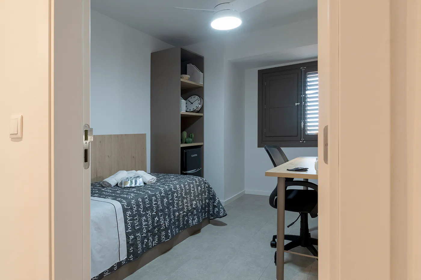 Excellent private room in a shared apartment in the center of Valencia in the Barrio del Carmen. Characteristics: 14m2 room with private bathroom in a shared flat, it has a large window which makes it very bright, it is fully equipped so that you do not lack anything and with all the comforts you may need during your stay. The single room has air conditioning, a bed with a chest, a desk with a chest of drawers, a chair, a wardrobe, a shelf unit, and a fridge. We also have a security system in which you can access your room using an electronic lock. The apartment is perfectly equipped with all the details and with the latest technology with the sole purpose of making you feel at home. The kitchen is fully equipped, with an oven, microwave, ceramic hob, toaster and coffee maker, individual locker to store food, as well as kitchenware, cutlery, and crockery. The location of the Moontels Barrio del Carmen apartments is privileged as it is located in the center of Valencia, with the best services and a wide multicultural offer. It is also located of all the metro and bus transport services. Exclusive services of our apartments: • Moontels keeper (personal assistance) • High-speed WIFI • Weekly cleaning of common areas •Sheets and towels •Electronic lock • Private fridge •Private bathroom •Air conditioning • 24-hour self-service laundry (by payment) • Supplies will be charged on actual consumption MOONTELS BARRIO DEL CARMEN Stay in one of the best neighborhoods in Valencia, Moontels Barrio del Carmen has an excellent location right in the center, a few steps from Plaza de la Virgen. The neighborhood is one of the main cultural, historical, and leisure spots in Valencia. It also has a great multicultural offer, activities, historic buildings, bars, and restaurants. The building has different shared apartments that are decorated and furnished with style, perfectly equipped with all the details and with the latest technology with the sole purpose of making you feel at home. What will you find in our Moontels Barrio del Carmen accommodation? Shared apartments with up to 4-5 rooms with equipped kitchen and dining room, single rooms with private bathroom and air conditioning. Exclusive services of our apartments: • Moontels keeper (personal assistance) • High-speed WIFI • Weekly cleaning of common areas • Sheets and towels • Electronic lock • Private fridge • Private bathroom • Air conditioning • 24-hour self-service laundry Services: Elevator, air conditioning, fan, bedding and towels, washing machine, dryer, iron, furnished, private bathroom, kitchen equipped with individual locker, etc....