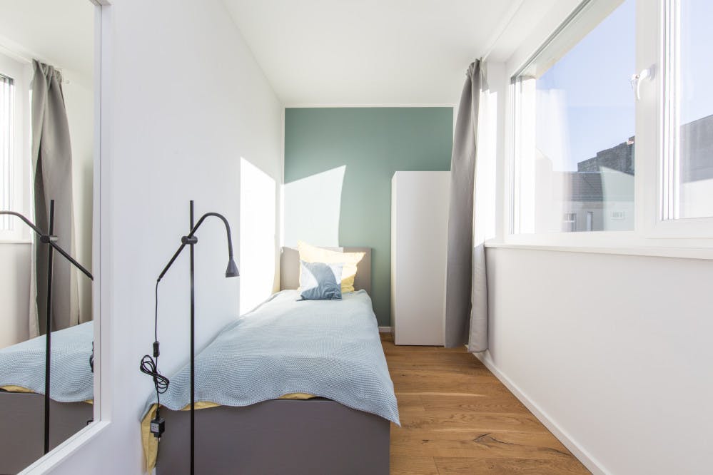 Welcome to our beautiful newly renovated apartments, where you bring the spirit and we take care of the rest! Our large number of co-living apartments all consist of spacious and bright rooms in a modern design. The best part is, everything is already fully furnished. In other words, you can literally grab your suitcase and move in tomorrow! Additionally, not only all of the rooms are already equipped with the essentials like electricity, water and internet, but we also offer numerous other facilities that are included in the price. Whether you would like to do sports in our fitness rooms, study in the coworking areas or socialise during organised workshops and events; we have it all! We are located in ‘Wedding’, which has become one of the trendiest areas in Berlin, throughout recent years. Today, Leopoldplatz is surrounded by residential areas, shops, and dining establishments. Wedding is characterized by its diverse mix of cultures and social backgrounds, and the Leopoldplatz district reflects this diversity, creating a vibrant atmosphere. You'll find numerous stores, cafes, restaurants, and markets offering a variety of culinary specialties and products. The district is also home to some green oases, such as Rehberge Park and Schiller Park, providing opportunities for relaxation and recreation. Leopoldplatz is well-served by public transportation. Due to its central location, all other exciting parts of Berlin can easily be reached by public transportation, with U6 and U9 lines arriving at the Leopoldplatz (2-mintue walk) on a regular basis. Overall, the Leopoldplatz district in Wedding offers a diverse and lively experience with an interesting history, cultural diversity, and plenty of options for shopping, dining, and relaxation. With open-minded and international people this place will not only provide you with an amazing new home, but you will also be part of our international and open-minded community, that you do not want to miss out on. Services / facilities that are INCLUDED in the price: - heating, electricity, water - high speed internet - fitness room - community area - working spaces - gaming area - security (camera surveillance) - outdoor areas that can be used as sports facilities - bicycle parking spaces - community manager - great location - *laundry room (including washing machine & dryer) *Please note that although a common laundry room is included in the price, the costs per washing cycle / program are paid individually (2,80€ washing machine & 2,50€ dryer) and are therefore not included in the overall price. Additional services / facilities that are NOT INCLUDED in the price: - parking space (can be booked on request) What exactly does “fully equipped” mean? Being able to move into a new place the next day does not happen very often, yet we make it possible! Therefore, we have not only taken care of all the necessary amenities, but these are also included in the price and do not involve any additional charges. To give you an overview of your new home, we have listed all of the integrated facilities below: The apartment: • equipped kitchen • oven • *balcony / terrace The bedroom: • wardrobe • desk • chair • mirror • lamp • bed (90 cm) • mattress • blanket • pillow • curtains • floor lamp • shelf • drawer • heating unit *Please note that not all of the rooms have a balcony or terrace. Furthermore, those that do are sometimes shared and therefore more than one room may have access to the same balcony. The exact details of each individual room within the apartment can be seen on the according floorplan, which is included in the pictures. REQUIRED documents: - Proof of income (last 3 months) or work contract - Proof of enrolment (students) - Guarantor (only if you do not have proof of income) - Copy of guarantor's ID (only if you do not have proof of income) - Copy of guarantor's work contract (only if you do not have proof of income) *the landlord only accepts tenants under the age of 40* Check-in /out: - Check-in hours: Monday - Friday from 10:00 - 16:00 - The key transfer will take place at Village M (you will receive the address once your booking is confirmed) Please be aware once the booking is done on HousingAnywhere we will provide you with the contract. In order for you to get your keys, the deposit must be transferred to our bank account. IMPORTANT!!! Please take into account that these are example pictures of the fourth floor. Although all rooms are exactly the same, the color of the furniture may differ. Additionally, the decoration is solely included for inspirational purposes and will not be present in your room either...