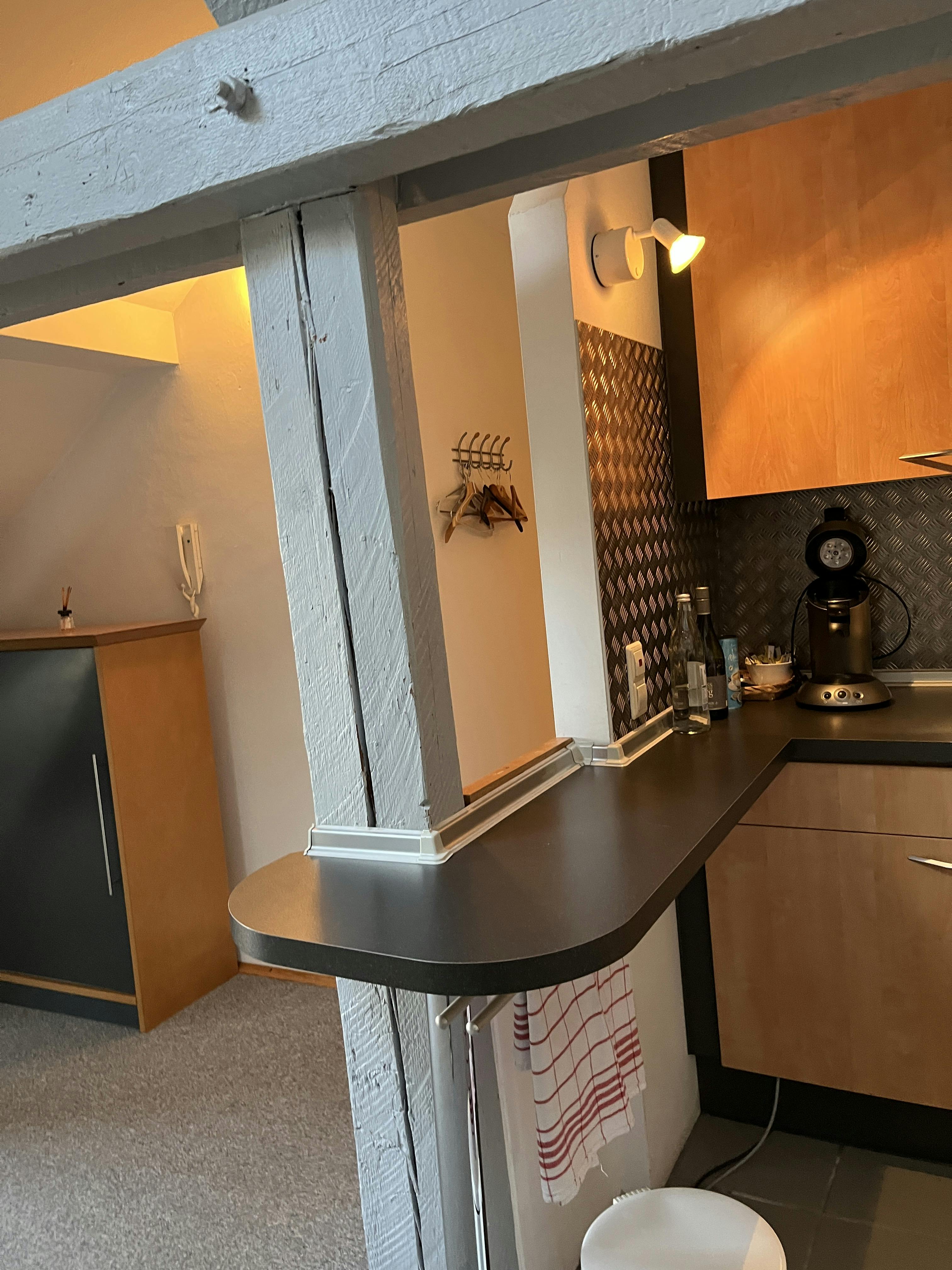 Ein Appartement mit Doppelbett, Pantryküche, Schreibtisch, WC, Dusche. Komplett eingerichtet mit TV, WLAN. 1. Etage im "Torhaus" eines historischen Gutshofes. Dachschrägen....