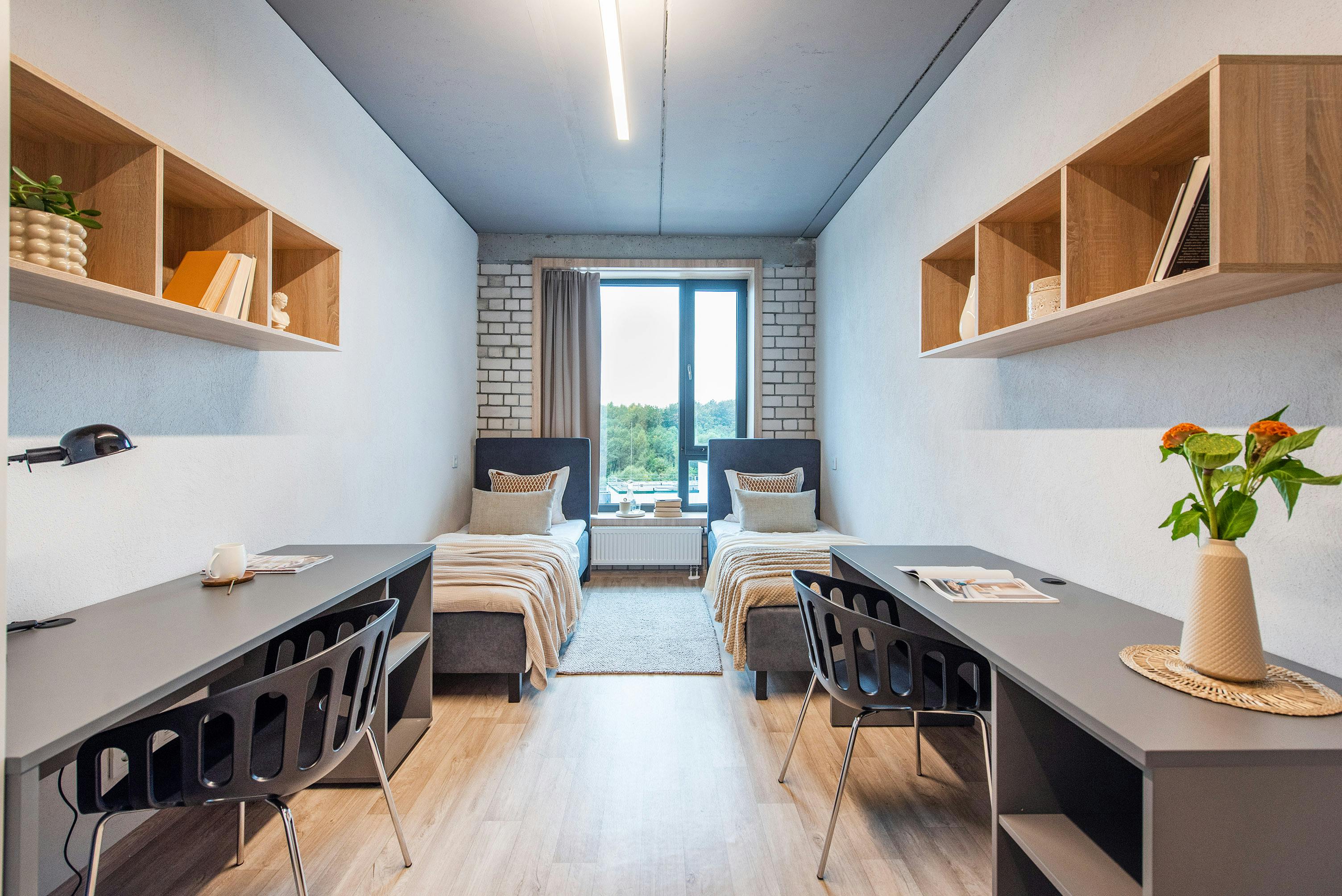Studiați, lucrați, conectați-vă și simțiți-vă ca acasă.Descoperă mai multe reședințe studențești în ВильнюсSHED Co-living Vilnius is a modern student accommodation complex newly built in 2022. SHED Co-living Vilnius is located in Santariškių suburb, 30 mins distance by bus from city center. All commute options are just near the accommodation place, easily reached in few mins by walking. Through the windows fresh air from the forest is blowing and residents can meet all the colors of a year on the leaves of forest trees. From the rooftop terrace everyone can watch sunset and enjoy the silence. Few minutes' walking distance there is a big supermarket where residents can get anything they need: grocery, flowers, haircut, pharmacy etc. Also, in the neighbour is located the main hospital in the city - Santaros clinics. Once newcomers step into SHED building, they are met by helpful administration or house management which help with all move in questions and registrations. In a reserved private room, everyone gets fully furnished area with bed, table, chair, wardrobe, kitchenette with cupboard, sink, microwave, fridge and freezer, as well as private bathroom with sink, shelf, toilet and shower. If they miss something in their room, they can always borrow from common spaces. Bed linen, sheets, kitchen utensils are not privided in the room – a tenant may buy at the reception or bring his own. Everyone has access to all communal zones: study/work room, gaming and leisure areas, gym, rooftop terrace, backyard, cinema screen, big common kitchen with modern equipment, bike room, laundry room (extra fee), parking (extra fee). Staff and house managers are on duty daily, common zones are cleaned everyday workday, but extra order of room cleaning may be available on site. The room is reserved only when the deposit fee is paid to landlord’s bank account. The deposit is not refundable for any of personal reasons (inc. no show, change of plans, Visa, university issues or other). Two comfy beds, 90 cm x 200 cm each Mattresses Private kitchenette: fridge-freezer, microwave, hotplate stove, kitchen utensils, kitchen hood Private bathroom: shower, toilet, sink, heater Computer desks & a chairs Wardrobes Fast Wi-Fi All-inclusive billing: accommodation fee, utilities, Wi-Fi, gym, etc. On-site staff & security, CCTV cameras Room cleaning service (by request for additional price only) Bedroom & bathroom textiles (pillows, blankets, bed linen and towels) are available for purchase at reception...