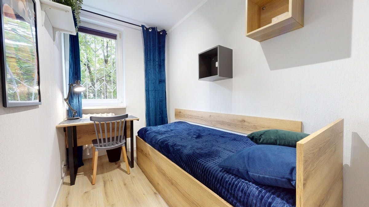 🏡 Your new home in Warsaw! This private bedroom offers a bed, a wardrobe and a desk. The windows allow a lot of natural light in, making this room vibrant and perfect for studying or working. The modern kitchen, which you share with other tenants, is fully equipped. We welcome international students and workers and hope to foster a social and friendly environment for all our tenants!⭐...