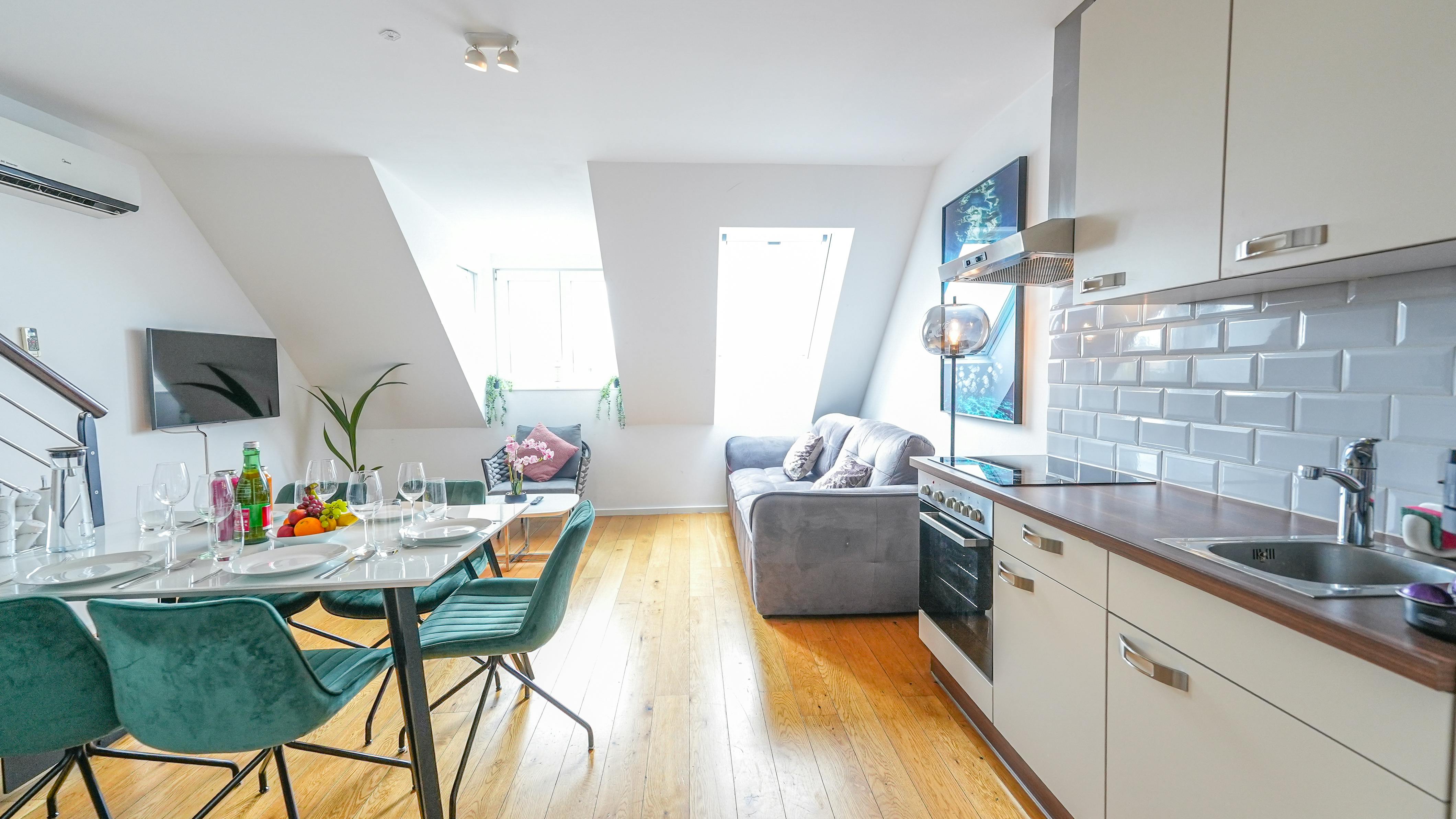 GROSSES MAISONETTE APARTMENT MIT GEMEINSCHAFTSTERRASSSE Dieses Apartment umfasst einen Eingangsbereich, einen Wohnbereich mit einem ausziehbaren Sofa für 2 Personen und einem Flachbild-TV, eine Küchenzeile mit einer Essecke sowie ein WC auf der unteren Ebene. Auf der oberen Ebene befinden sich ein Dreibettzimmer (mit einem Flachbild-TV), ein Bad mit Dusche, ein Bad mit Badewanne und eine Terrasse, die Sie gemeinsam mit den Bewohnern eines anderen Apartments nutzen. Die Ebenen sind durch eine moderne Treppe miteinander verbunden. Das Apartment ist klimatisiert und bietet kostenfreies WLAN, einen Haartrockner, Bettwäsche und Handtücher. Kaffeekapseln können Sie an der Rezeption erwerben....