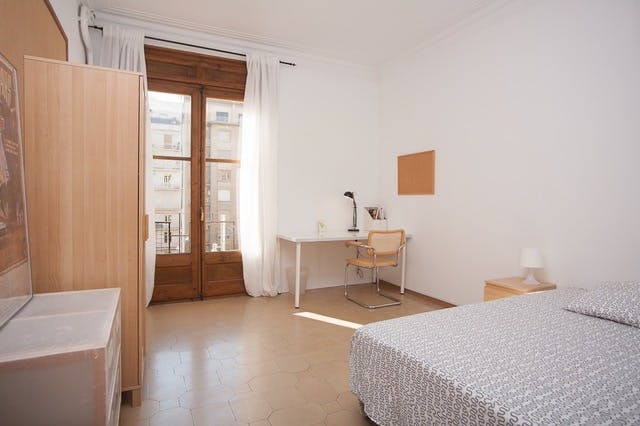 APARTMENT DESCRIPTION: Gracia Apartment is of 180m2 and is at an unbeatable location. It is placed in the second floor of a building with a porter and an elevator. It has 6 rooms, three big and exterior rooms, two standard rooms and one economic. There are many windows in the apartment providing lots of natural light. Common areas include a lounge with a big leather sofa, flat screen TV and a dining/working area. There are three bathrooms, two with a shower,sink and toilet and one with a bath, sink and toilet. The kitchen is fully equipped and has all the utensils you might need to cook your meals during your stay. It also has a big storage/laundry room, perfect to drop your suitcase or anything that would disturb in your room. Cleaning service for all common areas is once a week. Free wireless internet connection is available. LOCATION: Gràcia neighborhood is known as the bohemian district with many leisure activities to do. It is the favorite location for students and young people. Gràcia nonetheless has more a local than a cosmopolitan feel to it, with many people on the public squares sitting and chatting and living a part of their life publicly and in a community. The apartment is very well connected with the public transport network. Close to the apartment, there are three different metro lines, many bus lines and Plaza Catalunya FGC. The IED university is at walking distance and UB and Pompeu Fabra universities are 10 minutes with public transportation away. Many groceries stores and supermarkets are nearby. PUBLIC TRANSPORT: - Metro: L3, L4, L5 - Bus: 17, 19, 40, 45, 120 Bedroom Highlights: • 15m2 room • Big window • A lot of natural sunlight • Really bright • Big private balcony over a little park Bedroom Furniture: • Double bed • Bedside table • Big wardrobe • Big desk • Chair • Chest of drawers ----- Be aware that HousingAnywhere is an online booking platform. Therefore exchanging CONTACT DETAILS and offering VIEWINGS is NOT POSSIBLE. The rent and deposit might be needed to be paid in cash, upon request of the landlord. The platform keeps your payment safe until 48 hours after your move-in date. In case the accommodation is not as advertised, you will be entitled to get a refund. -----...