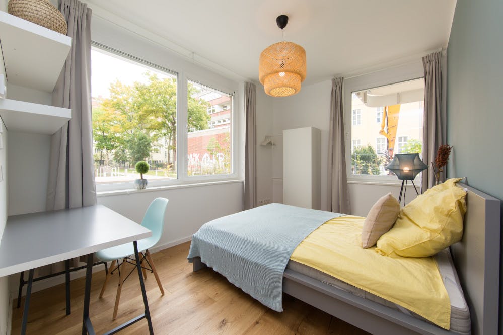 Welcome to our beautiful newly renovated apartments, where you bring the spirit and we take care of the rest! Our large number of co-living apartments all consist of spacious and bright rooms in a modern design. The best part is, everything is already fully furnished. In other words, you can literally grab your suitcase and move in tomorrow! Additionally, not only all of the rooms are already equipped with the essentials like electricity, water and internet, but we also offer numerous other facilities that are included in the price. Whether you would like to do sports in our fitness rooms, study in the coworking areas or socialise during organised workshops and events; we have it all! We are located in ‘Wedding’, which has become one of the trendiest areas in Berlin, throughout recent years. With countless bars, restaurants and shops right around the corner, this district has everything you may need within walking distance. Furthermore, due to its central location, all other exciting parts of Berlin can easily be reached by public transportation, with U6 and U9 lines arriving at the Leopoldplatz (2-mintue walk) on a regular basis. With open-minded and international people this place will not only provide you with an amazing new home, but you will also be part of our international and open-minded community, that you do not want to miss out on. Services / facilities that are INCLUDED in the price: - heating, electricity, water - high speed internet - fitness room - community area - working spaces - gaming area - security (camera surveillance) - outdoor areas that can be used as sports facilities - bicycle parking spaces - community manager - great location - *laundry room (including washing machine & dryer) *Please note that although a common laundry room is included in the price, the costs per washing cycle / program are paid individually (2,80€ washing machine & 2,50€ dryer) and are therefore not included in the overall price. What exactly does “fully equipped” mean? Being able to move into a new place the next day does not happen very often, yet we make it possible! Therefore, we have not only taken care of all the necessary amenities, but these are also included in the price and do not involve any additional charges. To give you an overview of your new home, we have listed all of the integrated facilities below: The apartment: • equipped kitchen • oven • dishwasher • *balcony / terrace The bedroom: • wardrobe • desk • chair • mirror • lamp • bed (140 cm) • mattress • blanket • pillow • curtains • floor lamp • shelf • drawer • heating unit *Please note that not all of the rooms have a balcony or terrace. Furthermore, those that do are sometimes shared and therefore more than one room may have access to the same balcony. The exact details of each individual room within the apartment can be seen on the according floorplan, which is included in the pictures. REQUIRED documents (AFTER BOOKING IS CONFIRMED): - Proof of income (last 3 months) or work contract - Proof of enrolment (students) - Guarantor (only if you do not have proof of income) - Copy of guarantor's ID (only if you do not have proof of income) - Copy of guarantor's work contract (only if you do not have proof of income) *the landlord only accepts tenants under the age of 40* Check-in /out: - Check-in hours: Monday - Friday from 10:00 - 16:00 - The key transfer will take place at Village M (you will receive the address once your booking is confirmed...