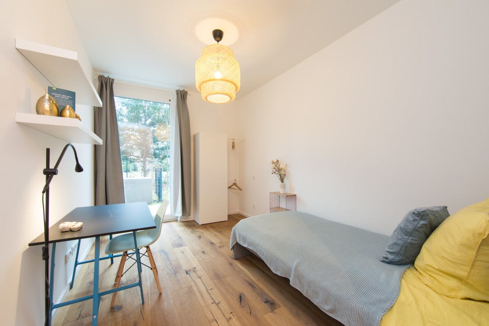Welcome to our beautiful newly renovated apartments, where you bring the spirit and we take care of the rest! Our large number of co-living apartments all consist of spacious and bright rooms in a modern design. The best part is, everything is already fully furnished. In other words, you can literally grab your suitcase and move in tomorrow! Additionally, not only all of the rooms are already equipped with the essentials like electricity, water and internet, but we also offer numerous other facilities that are included in the price. Whether you would like to do sports in our fitness rooms, study in the coworking areas or socialise during organised workshops and events; Village M has it all! We are located in ‘Wedding’, which has become one of the trendiest areas in Berlin, throughout recent years. Today, Leopoldplatz is surrounded by residential areas, shops, and dining establishments. Wedding is characterized by its diverse mix of cultures and social backgrounds, and the Leopoldplatz district reflects this diversity, creating a vibrant atmosphere. You'll find numerous stores, cafes, restaurants, and markets offering a variety of culinary specialties and products. The district is also home to some green oases, such as Rehberge Park and Schiller Park, providing opportunities for relaxation and recreation. Leopoldplatz is well-served by public transportation. Due to its central location, all other exciting parts of Berlin can easily be reached by public transportation, with U6 and U9 lines arriving at the Leopoldplatz (2-mintue walk) on a regular basis. Overall, the Leopoldplatz district in Wedding offers a diverse and lively experience with an interesting history, cultural diversity, and plenty of options for shopping, dining, and relaxation. With open-minded and international people this place will not only provide you with an amazing new home, but you will also be part of our international and open-minded community, that you do not want to miss out on. Services / facilities that are INCLUDED in the price: - heating, electricity, water - high speed internet - fitness room - community area - working spaces - gaming area - security (camera surveillance) - outdoor areas that can be used as sports facilities - bicycle parking spaces - community manager - great location - *laundry room (including washing machine & dryer) *Please note that although a common laundry room is included in the price, the costs per washing cycle / program are paid individually (2,80€ washing machine & 2,50€ dryer) and are therefore not included in the overall price. What exactly does “fully equipped” mean? Being able to move into a new place the next day does not happen very often, yet we make it possible! Therefore, we have not only taken care of all the necessary amenities, but these are also included in the price and do not involve any additional charges. To give you an overview of your new home, we have listed all of the integrated facilities below: The apartment: • equipped kitchen • oven • *balcony / terrace The bedroom: • wardrobe • desk • chair • mirror • lamp • bed (140 cm) • mattress • blanket • pillow • curtains • floor lamp • shelf • drawer • heating unit • shared balcony / terrace (access from E.01.2 & E.01.3) *Please note that not all of the rooms have a balcony or terrace. Furthermore, those that do are sometimes shared and therefore more than one room may have access to the same balcony. The exact details of each individual room within the apartment can be seen on the according floorplan, which is included in the pictures. REQUIRED documents: - Proof of income (last 3 months) or work contract - Proof of enrolment (students) - Guarantor (only if you do not have proof of income) - Copy of guarantor's ID (only if you do not have proof of income) - Copy of guarantor's work contract (only if you do not have proof of income) *the landlord only accepts tenants under the age of 40* Check-in /out: - Check-in hours: Monday - Friday from 10:00 - 16:00 - The key transfer will take place at Village M (you will receive the address once your booking is confirmed) Please be aware once the booking is done on HousingAnywhere we will provide you with the contract. In order for you to get your keys, the deposit and our one-time service fee of 199€ must be transferred to our bank account. IMPORTANT!!! Please take into account that the decoration is solely included for inspirational purposes and will not be present in your room...