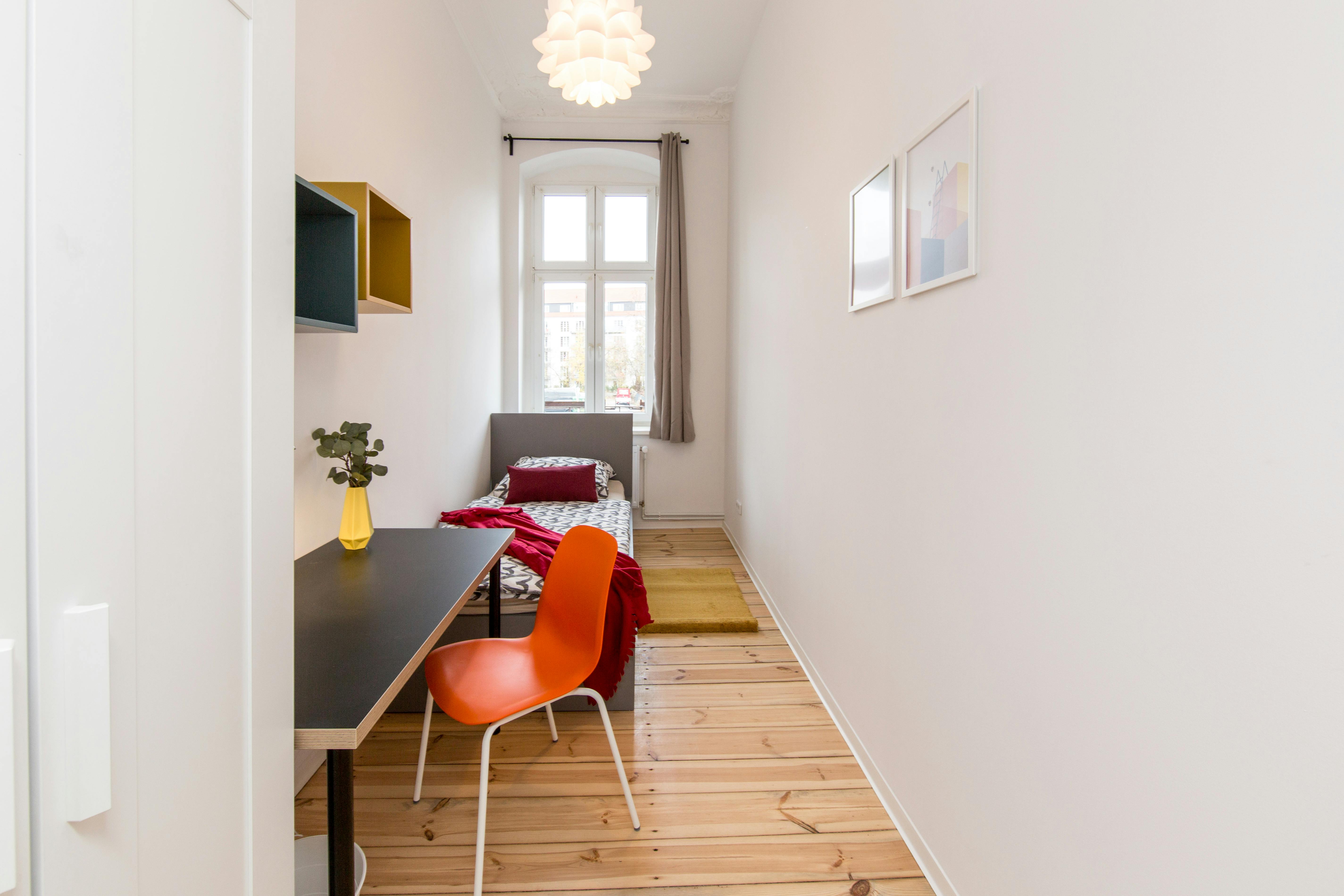 Hi Guys, ROOM 4 this is a fully furnished room in a shared flat. The room has a comfortable bed, a desk with chair and a wardrobe for your clothes. Also the common areas are fully equipped with washing machine, cooking equipment and all you need for your daily living. Anmeldung/Registration is possible. The monthly rent price is all inclusive (rent + heating + water + Internet + GEZ/german TV license fee). For the move in dates we have only the 1st or the 16th of each month a tenant can move in. In specific cases we have a flexible move in date, but this needs to discuss in our messages :) Please note that there is an additional service fee of 100,00€ that has to be paid via bank transfer prior to move-in plus the deposit of 950€, which needs to be payed before move in via bank transfer in a single payment....