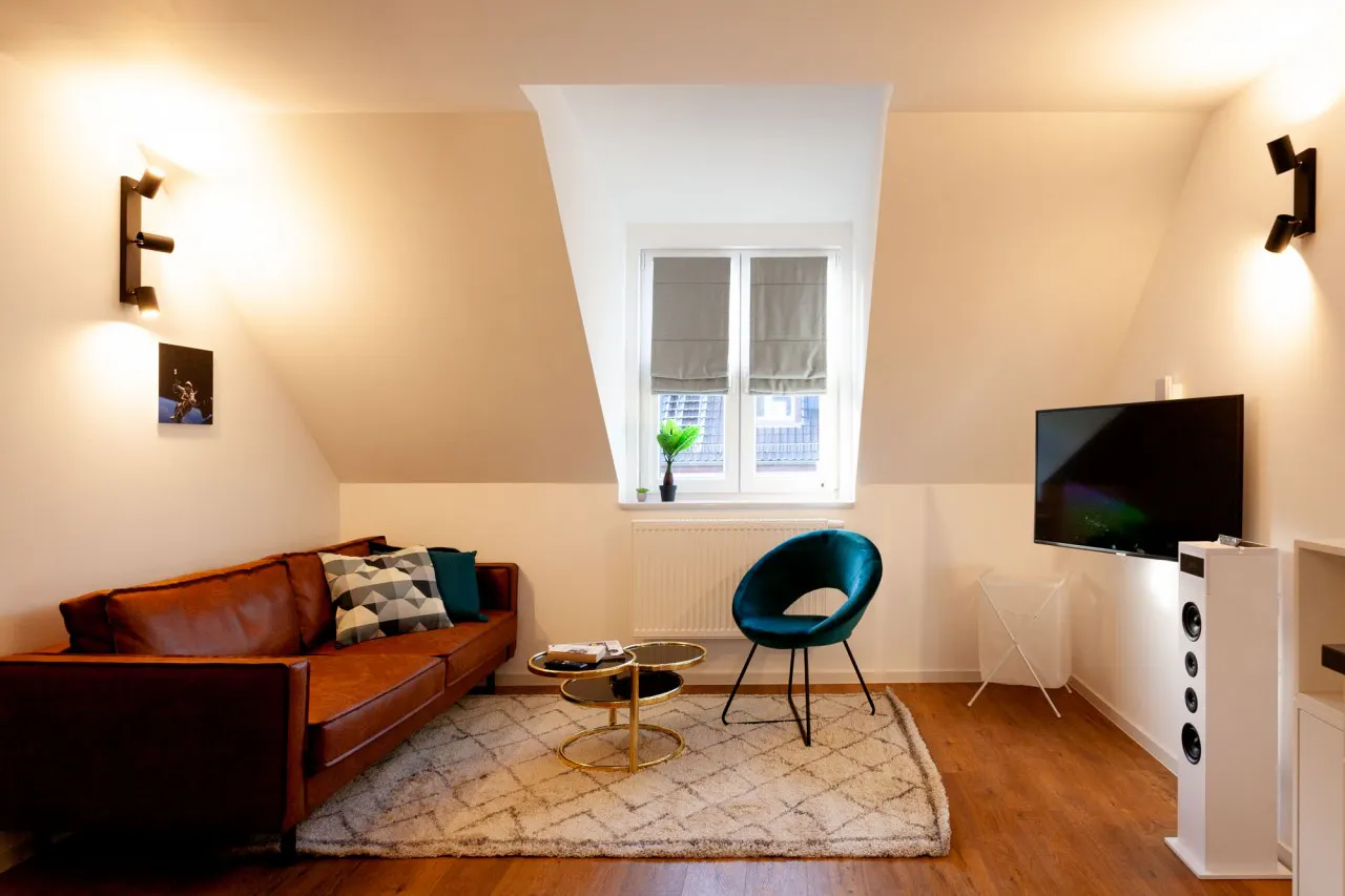Bitte beachten Sie, dass HousingAnywhere eine Online-Buchungsplattform ist. Daher ist es nicht möglich, Kontaktdaten auszutauschen und Besichtigungen anzubieten. Wenn Sie diese Unterkunft reservieren möchten, senden Sie mir eine Buchungsanfrage oder eine Nachricht! Please note that HousingAnywhere is an online booking platform. Therefore it is not possible to change contact data or do viewings prior to booking. If you want to reserve this place, send me a booking request or a message! Kaution: 2.500 €,- Internet inkl. Hausmeisterservice incl. Reinigungsservice inkl. (1 x im Monat) Reinigungsservice zubuchbar € 95,20.- inkl.. MwSt. (für 2 x im Monat) Endreinigung € 250.- zzgl. MwSt. ***ENGLISH*** Deposit: € 2500 Internet included Caretaker service included Cleaning service included (once a month) Additional cleaning service available for € 95.20 incl. VAT (twice a month) Final cleaning: € 250 plus VAT Dieses ca. 30 qm große und 2019 neu errichtete, luxuriöse 1-Zimmer Apartment im DG eines um 1925 erbauten Wohnhauses ist mit Designer-Möbeln stilvoll und modern eingerichtet. Es hat eine mit vielen Elektrogeräten offene Küche, einen Eßbereich sowie einen großen Wohn- und Schlafbereich. Das Badezimmer beeindruckt mit seiner großzügigen Regendusche, dem Designer-Waschbecken und hochwertigen Armaturen. Highlights sind seine reflektierenden Decken und das Belichtungskonzept. Weitere Ausstattungsmerkmale sind das trittschallgedämmte Vinyl-Parkett, schnelles W-LAN und der Smart-TV. Zur Ausstattung gehören u. a., Vorhänge, Staubsauger, Bügeleisen, Bügelbrett, Handtücher und Bettwäsche. ***ENGLISH*** This recently renovated upscale efficiency of about 30 sqm is on the fourth upper floor of an apartment building built around 1925. It was totally modernized in 2019. The apartment consists of a fully equipped kitchen with many electric appliances, a living room with dining area and a separate bedroom. The bathroom provides a large rain shower, a designer washbasin and high-class appliances. Highlights of this apartment are the subtly reflecting ceilings, the sophisticated furniture, the lighting concept, WIFI and a dual Smart-TV. The floors are of fine vinyl parquet. The apartment curtains, a vacuum cleaner, an iron and ironing board, towels and bed sheets. Die Schwalbacher Straße ist verkehrsmäßig hervorragend angebunden. Die S-Bahn Haltestelle "Galluswarte" ist nur fünf Gehminuten entfernt. Von dort erreicht man den Hauptbahnhof in zwei, die Innenstadt in fünf Minuten. Auch das Messegelände und der Anschluß an die Autobahn A-5 mit der Verbindung zum Flughafen sind in nächster Nähe. ***ENGLISH*** There is perfect access to public transport. A five minute walk to the S-Bahn station “Galluswarte” will take you to the main train station in two minutes, to downtown (“Hauptwache”) in five minutes or even to the airport. The exhibition complex (“Messe”) is close by, as is access to the A-5 Autobahn. Das Haus beherbergt neun Premium-Apartmentwohnungen. Es liegt in einer ruhigen Seitenstraße im Herzen des Gallus-Viertels, unmittelbar neben dem neuen Europa-Viertel. Laut Presse wird das einstige Arbeiterviertel Gallus zum Vorzeigestadtteil. Entlang der Mainzer Landstraße mit seinen zahlreichen Geschäften und Restaurants entwickelt sich eine blühende, multikulturelle Szene, welche viele junge Professionals anzieht. ***ENGLISH*** The 4-storey building houses nine premium apartments. It is situated in a quiet side street in the heart of the Gallus Quarter and adjacent to the newly developed Europa-Center. According to press reports the former working class quarter is turning into a showcase of the conversion of industry to service. Along the Mainzer Landstraße with its many shops and restaurants we witness the development of a burgeoning multi-cultural scene which attracts many young professionals...