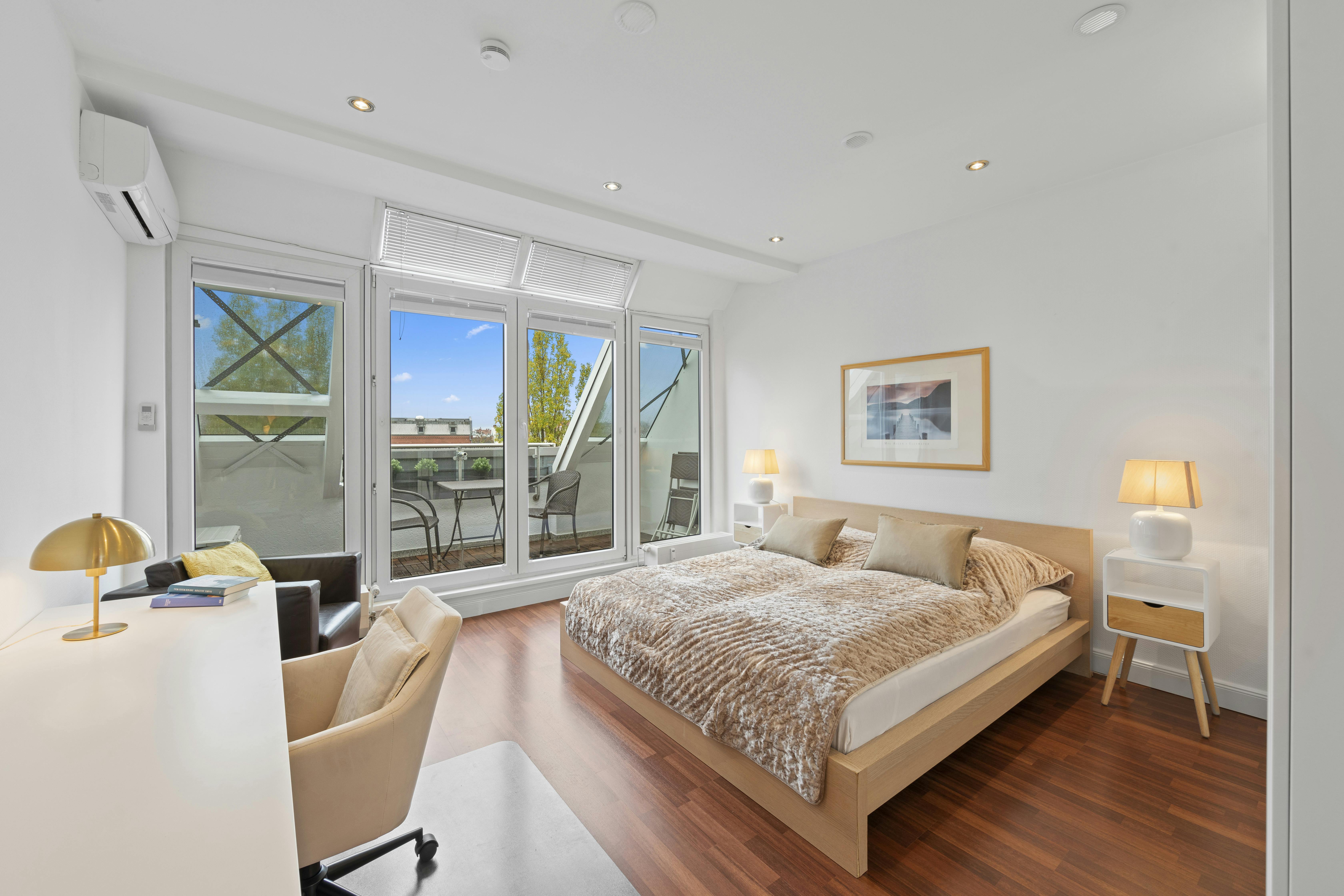 We take care of you! Personal support, only 1 month's rent deposit, no credit report. These are our advantages! Highly attractive, completely renovated penthouse with south-facing terrace and floor-to-ceiling windows, wonderfully flooded with sunlight. Wonderful view from the south-facing terrace over the Kulturbrauerei. Open kitchen with fridge, freezer, dishwasher, washing machine with dryer, Nespresso machine, including all cooking utensils. Very spacious bathroom with bathtub/glass shower wall and two washbasins. Living and sleeping areas are separated by a large wall unit. Separate workstation available. One double bed 180 x 200 cm. Air conditioning available. The apartment is located on the 5th floor of an old Berlin building without elevator. Perfect location in the trendy Prenzlauer Berg district. Around the corner is the Kollwitzplatz, the Kastanienallee, the Wasserturm, the Kulturbrauerei and the famous Mauerpark. It is only a 5 minute walk to the underground station Eberswalder Strasse. From here you can quickly get to the Alexanderplatz and the west of Berlin or to all other directions. Restaurants of all Nations are around. A Supermarket REWE is right across the street in the Kulturbrauerei, other shops for daily need as butcher, baker, dry cleaner or pharmacy are within walking distance. The rent includes also GEZ-fee, free WiFi and a cleaning of the apartment once a month. Only the electricity costs are charged separately all 3 month on personal consumption. You will get the „Wohnungsgeberbescheinigung“ (certificate of residence) by moving in. AUF DEUTSCH: Wir bieten Ihnen einen persönlichen Service, wir kümmern uns um Sie! Nur 1 Monatsmiete Kaution, keine Schufa-Auskunft! Hochattraktives, komplett renoviertes Penthouse-Apartment mit Süd-Terrasse und bodentiefen Fenstern, wundervoll sonnendurchflutet. Wunderschöner Blick von der Süd-Terrasse über die Kulturbrauerei. Offene Einbauküche mit Kühlschrank, Gefrierschrank, Spülmaschine, Waschmaschine mit Trockner, Nespresso Maschine, samt aller Kochutensilien. Sehr geräumiges Bad mit Wanne/Duschglaswand und zwei Waschbecken. Wohn- und Schlafbereich sind durch eine große Schrankwand getrennt. Separater Arbeitsplatz vorhanden. Ein Doppelbett 180 x 200 cm. Klimaanlage vorhanden. Die Wohnung liegt im 5. Stock eines Berliner Altbaus ohne Fahrstuhl. Perfekte Lage im angesagten Szene-Bezirk Prenzlauer Berg. Um die Ecke liegt der Kollwitzplatz, die Kastanienallee, der Wasserturm, die Kulturbrauerei und der Mauerpark. Nur 5 Gehminuten ist es bis zur U-Bahn Eberswalder Straße. Von hier gelangen Sie schnell zum Alexanderplatz, in den Westen oder wo immer Sie hinwollen. Restaurants aller Nationalitäten befinden sich in der nahen Umgebung. Ein Lebensmittelgeschäft (REWE) ist genau gegenüber in der Kulturbrauerei, weitere Geschäfte des täglichen Bedarfs wie Bäcker, Metzger, Reinigung, Apotheke etc. sind fußläufig zu erreichen. Im Preis sind die GEZ-Gebühren, WLAN, eine Reinigung einmal im Monat und die üblichen Nebenkosten enthalten. Lediglich der Strom wird separat nach eigenem Verbrauch berechnet. Wir bieten eine Wohnungsgeberbescheinigung....
