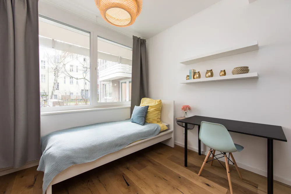 Welcome to our beautiful newly renovated apartments, where you bring the spirit and we take care of the rest! Our large number of co-living apartments all consist of spacious and bright rooms in a modern design. The best part is, everything is already fully furnished. In other words, you can literally grab your suitcase and move in tomorrow! Additionally, not only all of the rooms are already equipped with the essentials like electricity, water and internet, but we also offer numerous other facilities that are included in the price. Whether you would like to do sports in our fitness rooms, study in the coworking areas or socialise during organised workshops and events; we have it all! We are located in ‘Wedding’, which has become one of the trendiest areas in Berlin, throughout recent years. With countless bars, restaurants and shops right around the corner, this district has everything you may need within walking distance. Furthermore, due to its central location, all other exciting parts of Berlin can easily be reached by public transportation, with U6 and U9 lines arriving at the Leopoldplatz (2-mintue walk) on a regular basis. With open-minded and international people this place will not only provide you with an amazing new home, but you will also be part of our international and open-minded community, that you do not want to miss out on. Services / facilities that are INCLUDED in the price: - heating, electricity, water - high speed internet - fitness room - community area - working spaces - gaming area - security (camera surveillance) - outdoor areas that can be used as sports facilities - bicycle parking spaces - community manager - great location - *laundry room (including washing machine & dryer) *Please note that although a common laundry room is included in the price, the costs per washing cycle / program are paid individually (2,80€ washing machine & 2,50€ dryer) and are therefore not included in the overall price. What exactly does “fully equipped” mean? Being able to move into a new place the next day does not happen very often, yet we make it possible! Therefore, we have not only taken care of all the necessary amenities, but these are also included in the price and do not involve any additional charges. To give you an overview of your new home, we have listed all of the integrated facilities below: The apartment: • equipped kitchen • oven The bedroom: • wardrobe • desk • chair • mirror • lamp • bed (90 cm) • mattress • blanket • pillow • curtains • floor lamp • shelf • drawer • heating unit *Please note that these are example pictures. All Listings differ in Floor level. Not all of the rooms have a balcony or terrace. Furthermore, those that do are sometimes shared and therefore more than one room may have access to the same balcony. The exact details of each individual room,within the apartment can be seen on the according floorplan, which is included in the pictures. REQUIRED documents (AFTER BOOKING IS CONFIRMED): - Proof of income (last 3 months) or work contract - Proof of enrolment (students) - Guarantor (only if you do not have proof of income) - Copy of guarantor's ID (only if you do not have proof of income) - Copy of guarantor's work contract (only if you do not have proof of income) *the landlord only accepts tenants under the age of 40* Check-in /out: - Check-in hours: Monday - Friday from 10:00 - 16:00 - The key transfer will take place at Village M (you will receive the address once your booking is confirmed...