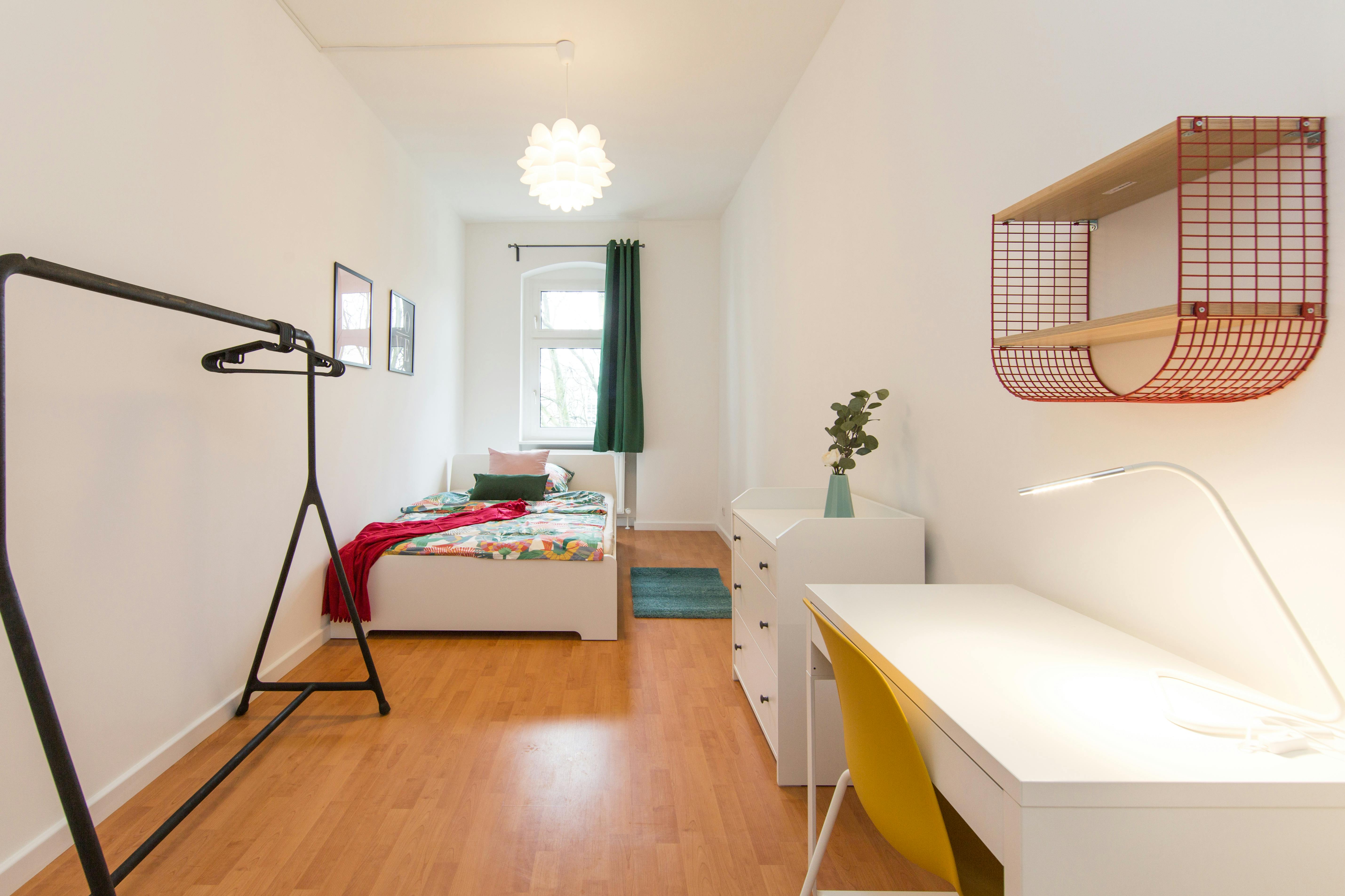 ROOM 2 this is a fully furnished room in a shared flat. The room has a comfortable bed, a desk with chair and a wardrobe for your clothes. Also the common areas are fully equipped with washing machine, cooking equipment and all you need for your daily living. Anmeldung/ Registration is possible. There are 2 bethrooms + 2 fridges The monthly rent price is all inclusive (rent + heating + water + Internet + GEZ/german TV license fee). For the move in dates we have only the 1st or the 16th of each month a tenant can move in. In specific cases we have a flexible move in date, but this needs to discuss in our messages :) Please note that there is an additional service fee of 100,00€ that has to be paid via bank transfer prior to move-in plus the deposit of 950€, which needs to be payed before move in via bank transfer in a single payment....
