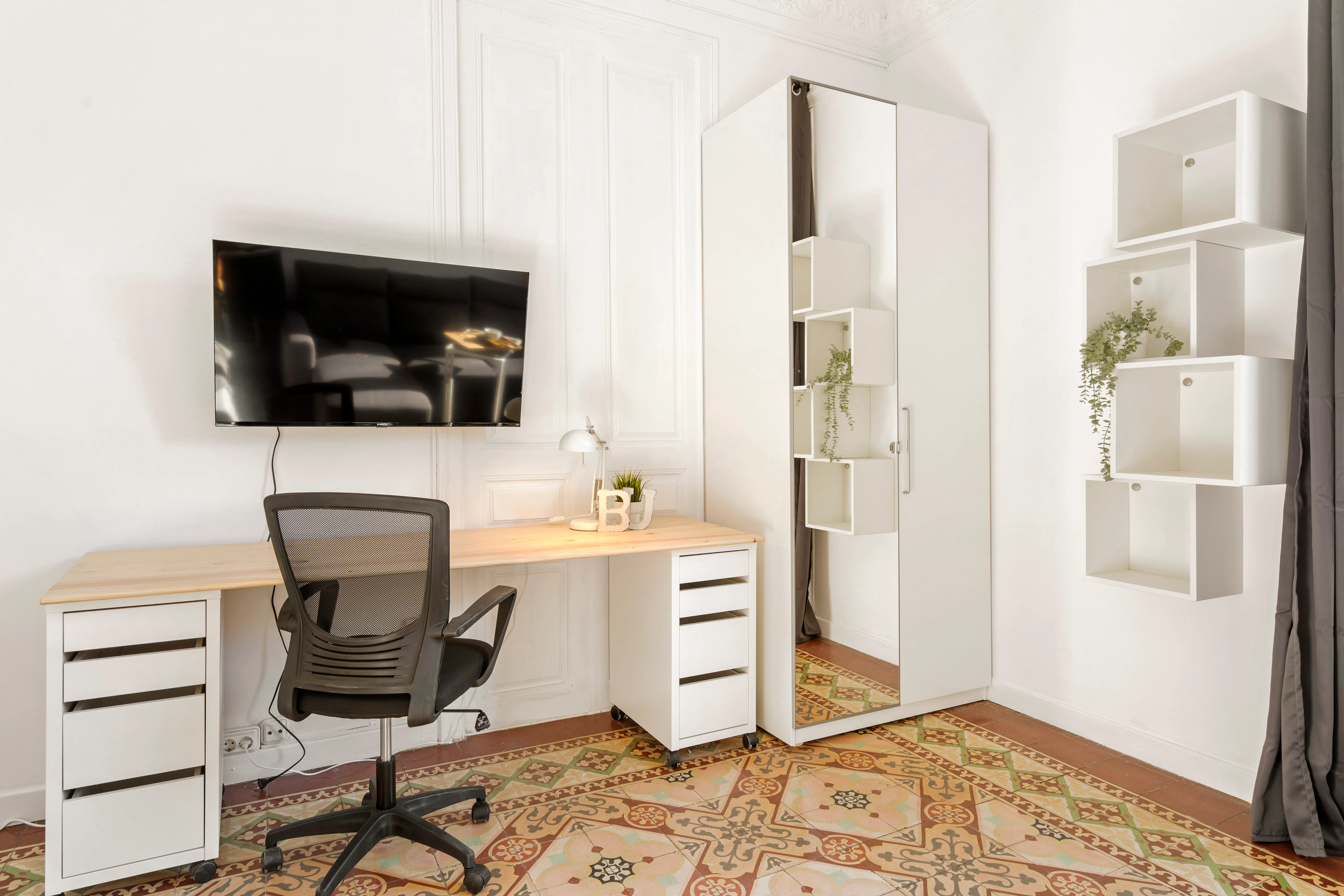 Private room equipped with desk and chair, bedside table, mirror, lamp, and closet. The bed does not include sheets and pillows, only the mattress cover. SERVICES AND RELEVANT INFORMATION: ✔Cleaning of common areas once a week. ✔Possibility of maintenance service. ✔Possibility of changing room or apartment to another in our portfolio. ✔Possibility of registration. ✔Customer service, consultations, and general issues during your stay. ✔Contract of minimum stay of 1 month and maximum of 12 months with the possibility of renewal. ✔Method of payment of all the costs: Bank transfer with all the amount paid before check-in. ✔Couples are not allowed ✔Pets are not allowed ✔No parties allowed on the property ✔No smoking allowed GENERAL CONDITIONS: ✔Deposit: 1 month's rent to be returned to you after the departure date (Rent + supplies). ✔Photographic inventory fee, to be paid only once before entering the room 64,15€ (Guarantees the return of the deposit to the owner by having photos of the state of the room, as it is delivered and returned). ✔Admin fee 453,75€ (393,25€ admin fee + 60,50€ asnef) - Check out fee 114,95€ - Check out fee 114,95€. ✔ID/Passport photo and bank details are required for the refund of the deposit at the end of the contract. CHECK-IN HOURS: ✔Monday to Friday 16:00 to 18:00 Free. ✔Monday to Friday 11:00 to 13:00 90,75€. ✔Monday to Friday 18:00 to 22:00 90,75€. ✔Monday to Friday 22:00 to 10:00 151,25€ ✔Weekends and Holidays 90,75€. Once your reservation is paid you will receive a unique welcome email from your landlord with all the information and instructions you need and where you will be asked for your personal documentation and bank details to make the rental contract. IT IS VERY IMPORTANT THAT YOU INDICATE CORRECTLY YOUR PHONE NUMBER AND EMAIL TO AVOID THAT THEY CAN NOT CONTACT YOU AND RUN THE RISK OF LOSING THE RESERVATION. If the owner does not receive all the necessary documentation previously requested by email and the payment of the total amount before check-in, you will have to pay an additional 181,50€ for a last-minute contract. Days before the move you will be contacted to arrange the check-in time. THE TENANT MUST NOT APPEAR IN THE CONTROL OF DELINQUENCY, OTHERWISE THE RESERVATION IS AT RISK. ⚠️ATTENTION: If the reservation is made on THE SAME DAY, the check-in must be made at least 48 HOURS LATER. We cannot do same-day check-in. The contracts are bi-weekly, thus paying the full fortnight of the month according to the day of booking. If the Check-in is made from the 20th of the month onwards, the following month will also have to be paid to avoid two consecutive payments. Note: The monthly utility bill also covers basic house maintenance, and weekly cleaning service....