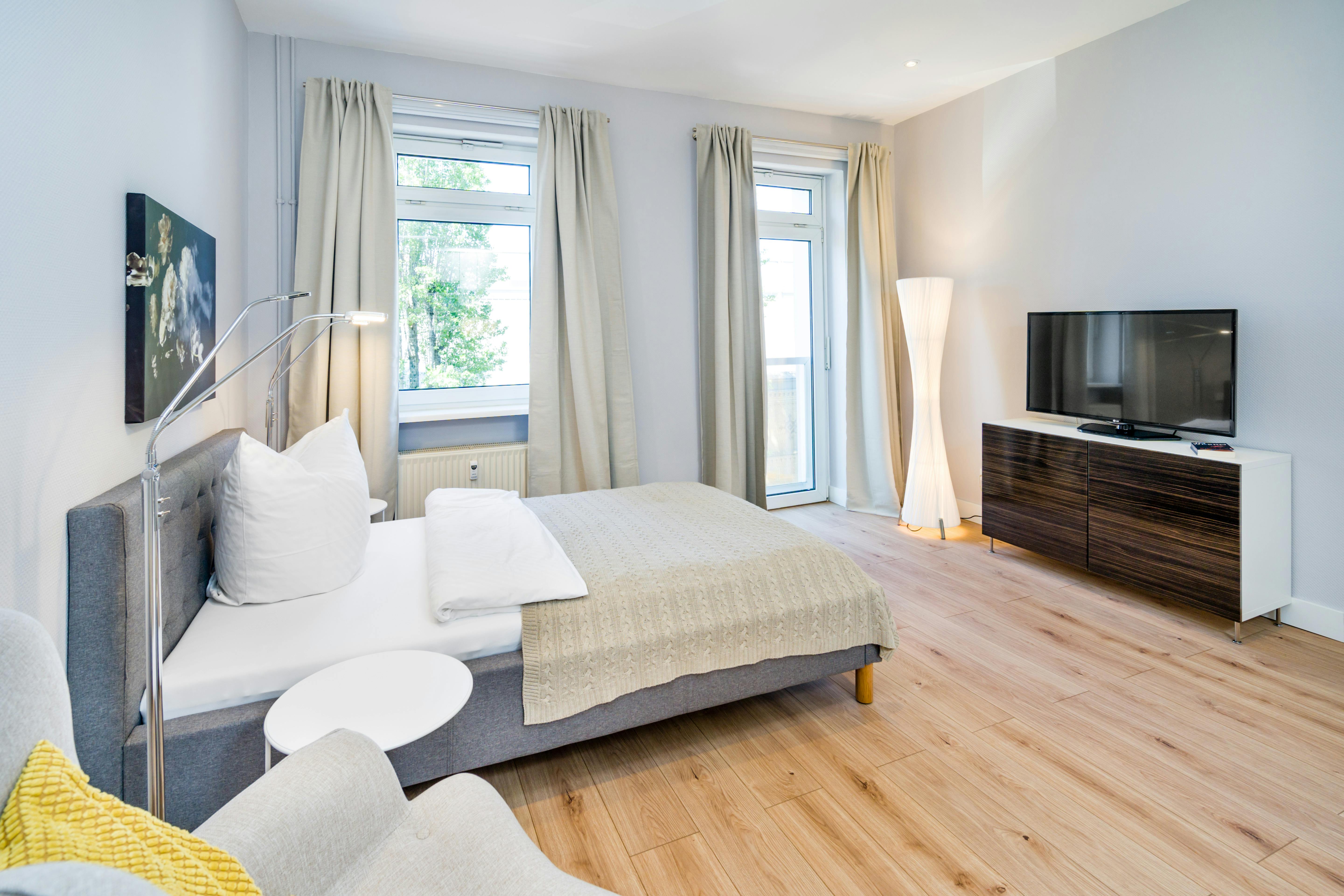 The apartment is located on the 3rd floor of an old Berlin building. You are right in the middle of the great life around of Prenzlauer Berg. The apartment is fully equipped: – living area with sitting chair, dining table, work desk (not shown in the photo!), flatscreen-TV – open kitchen with ceramic hob/oven, dishwasher, fridge, freezer, washing machine incl. dryer, crockery, cooking utensils, toaster, kettle, Nespresso machine – large bed (120 x 200 cm) and enough closets – Bathroom with bathtub + shower roller screen towels, hairdryer – Hallway with storage cabinet, mirror, wardrobe – as well as cleaning utensils, iron, ironing board, clothes horse – Pets not allowed Perfect location in the trendy Prenzlauer Berg district. Around the corner is the Kollwitzplatz, the Kastanienallee, the Wasserturm, the Kulturbrauerei and the famous Mauerpark. It is only a 5 minute walk to the underground station Eberswalder Strasse. From here you can quickly get to the Alexanderplatz and the west of Berlin or to all other directions. Restaurants of all Nations are around. A Supermarket REWE is right across the street in the Kulturbrauerei, other shops for daily need as butcher, baker, dry cleaner or pharmacy are within walking distance. The rent includes also GEZ-fee, free WiFi, a cleaning of the apartment once a month, concierge service and all other costs. Only the electricity costs are charged separately all 3 month on personal consumption. We rent up from 6 months with the possibility to extend. You will get the „Wohnungsgeberbescheinigung“ (certificate of residence) by moving in. The apartment is perfect for one person. IN GERMAN: Das Apartment liegt in der 3. Etage eines modernisierten Berliner Altbaus mit Blick auf die Kulturbrauerei. Trotzdem sind Sie mitten im quirligen Leben. Das Apartment ist voll ausgestattet: – Wohnbereich mit Lounge-Sessel, Esstisch, Stühle, Arbeitstisch (nicht auf dem Foto!), Flachbildschirm-TV – großes Bett (120 x 200 cm), genügend Schrankwände – offene Küche mit Ceranfeldherd/Backofen, Kühlschrank, Gefrierschrank, Waschmaschine inkl. Trockner, Geschirr, Kochutensilien, Toaster, Wasserkocher, Nespresso-Maschine – Bad mit Wanne + Duschrollo, Handtücher, Fön – Flur mit Schuschrank, Gaderobe – sowie Putzutensilien, Bügeleisen, Bügelbrett, Wäscheständer – Haustiere nicht erwünscht Perfekte Lage im angesagten Szene-Bezirk Prenzlauer Berg. Um die Ecke liegt der Kollwitzplatz, die Kastanienallee, der Wasserturm, die Kulturbrauerei und der Mauerpark. Nur 5 Gehminuten ist es bis zur U-Bahn Eberswalder Straße. Von hier gelangen Sie schnell zum Alexanderplatz, in den Westen oder wo immer Sie hinwollen. Restaurants aller Nationalitäten befinden sich in der nahen Umgebung. Ein Lebensmittelgeschäft (REWE) ist genau gegenüber in der Kulturbrauerei, weitere Geschäfte des täglichen Bedarfs wie Bäcker, Metzger, Reinigung, Apotheke etc. sind fußläufig zu erreichen. Im Preis sind ausserdem die GEZ-Gebühren, freies WLAN , eine Reinigung einmal im Monat, Concierge Service und die üblichen Nebenkosten enthalten. Lediglich die Stromkosten werden alle 3 Monate separat nach persönlichem Verbrauch berechnet. Wir vermieten ab 6 Monate mit der Möglichkeit der Verlängerung. Eine Wohnungsgeberbescheinigung wird ausgestellt. Das Studio eignet sich ideal für 1 Person....