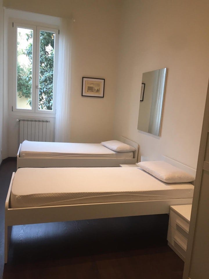 Spacious Shared Bedroom in Via del Ponte Sospeso This comfy apartment located on the 1st floor of a building in Via del Ponte Sospeso. The apartment consists of an entrance, an open cooking area to a living room with a dining table, 2 bathrooms, this double room for one person, and 2 others double room each one for 2 persons. This shared bedroom is furnished with 2 singles beds, a big wardrobe, and a bedside table. This property is located in Via del Ponte Sospeso. All shops, restaurants, markets, bars, and landmark are within walking distance. Public transportation is the best here and it connects all part of Florence. RECURRENT EXPENSES TO PAY: -The bills are not included: -€ 80 ADVANCE ELECTRICITY GAS WATER IN MONTH, at the end of the year we make the balance if you spent more you will pay the difference - € 15 condominium -€ 10 wifi I'll accept a booking at least till the end of July EXPENSES TO PAY ONLY ONCE: - AGENCY FEE: one-time agency fee will be requested at the entrance, to be paid only once. This agency fee includes check-in and check-out costs, contract registration, maintenance costs, assistance in case of breakdown of appliances, WA group dedicated to H24 assistance during the entire period of stay. - ONE TIME SERVICE FEE DI HOUSINGANYWHERE. When booking, a one-time service fee is required by the HousingAnywhere platform. - DEPOSIT: a deposit of € 600 is required at the entrance, which will be returned at the end of the period in the absence of damage to the property. Please be aware that HousingAnywhere is an online booking platform. Therefore exchanging contact details and offering viewings is not possible. If you would like to reserve this accommodation, send me a booking request or a message and please mention your age and occupation. I look forward to meeting you...