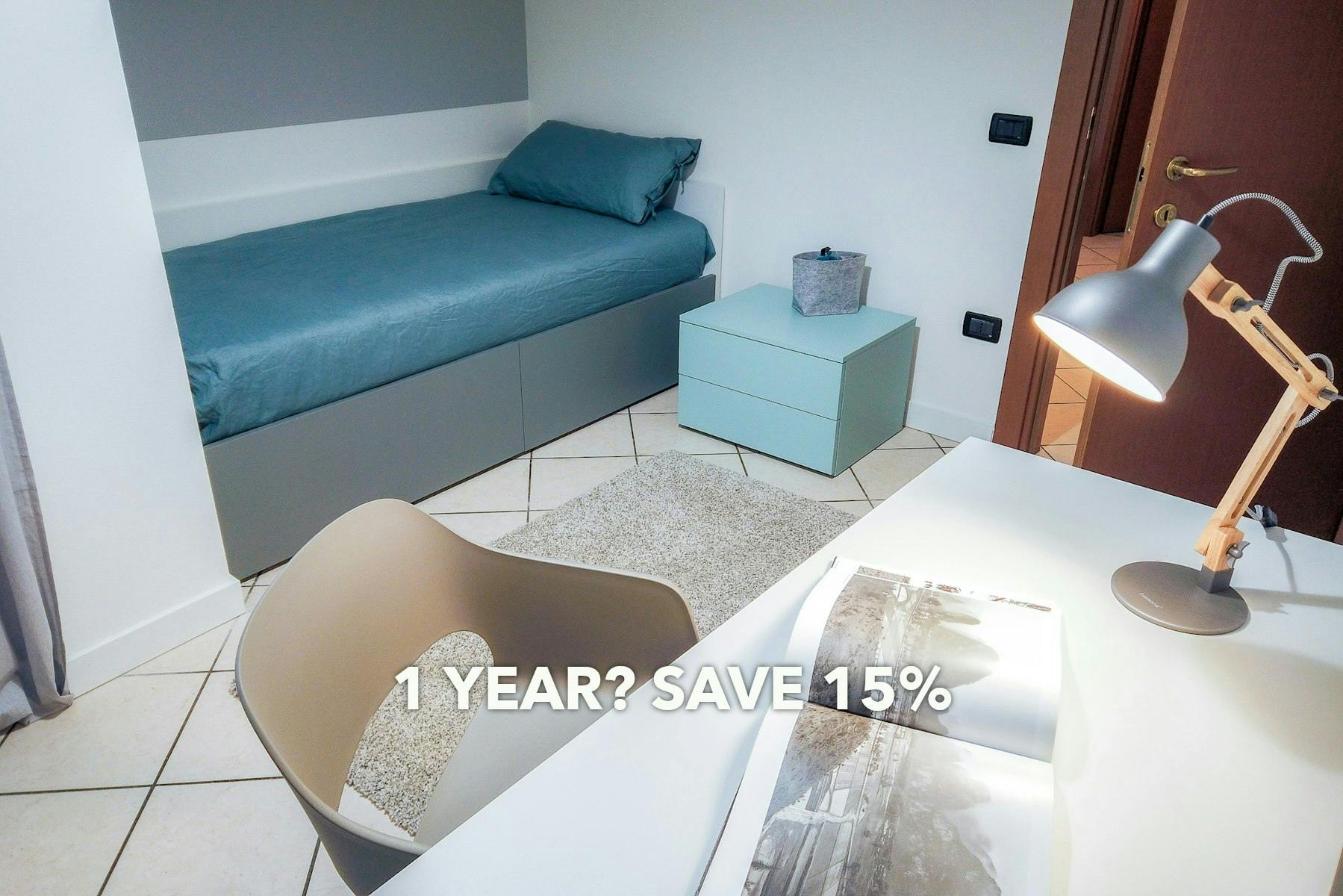 PHO. ROOM Apartment: beautiful single room tastefully furnished! At our company, we love long-term stays! Enjoy significant discounts when you stay with us for 12 months. If you need to stay for less than 12 months but find someone to take over for the remaining period, both of you will benefit from our substantial discounts. Ask for a quote today and start saving! Room: PHO. ROOM Apartments - comfortable singles and common spaces to live together! We designed this room to make your stay as pleasant as possible. The soft colors promote concentration, and the furniture - functional and designer - is characterized by lighting specifically chosen to create a welcoming and relaxing atmosphere. The beautiful built-in bed allows for plenty of space; the chair prevents back pain despite the many hours of studying you will have to face; the top quality mattress will guarantee you adequate rest; a 3-door wardrobe with chest of drawers will allow you to put your entire wardrobe in order. Apartment: 8 rooms designed specifically with the needs of those who live there in mind, with the aim of creating a functional environment, ideal for studying or working and at the same time for socializing. The large central area encourages co-living and co-studying, a precious opportunity for exchange to attend university profitably, while the single rooms offer all the space and privacy necessary for those who wish to be alone. The structure has: Cooking Area of 20 m2 with induction hob, oven, dishwasher and 50" TV Wifi 3 bathrooms - 3 washing machines and 1 dryer Bike parking Parking space We're a bit old-fashioned and still prefer deposits like the good old days, so we require the deposit payment to be made to the property manager's bank account immediately after completing the reservation process on HousingAnywhere...