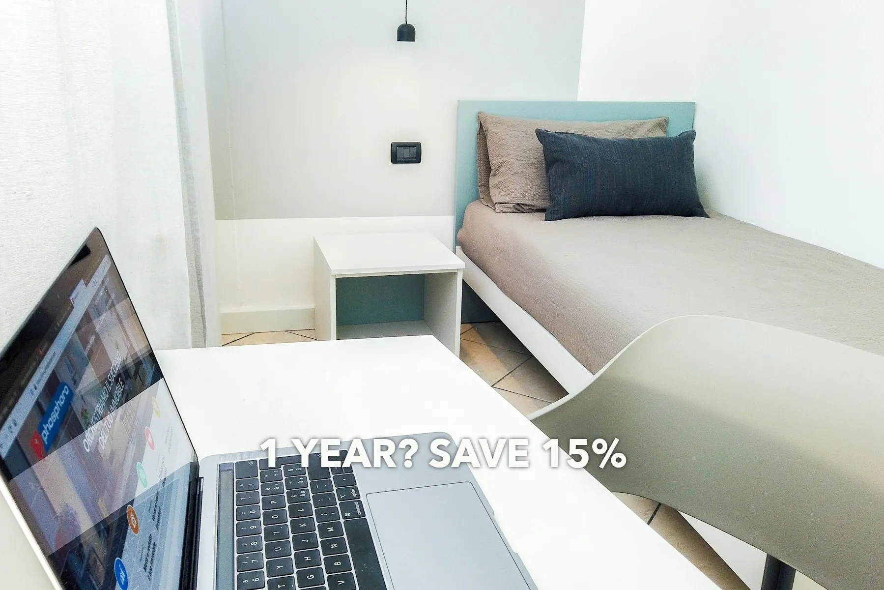 PHO. ROOM Apartment: Bright Single Room At our company, we love long-term stays! Enjoy significant discounts when you stay with us for 12 months. If you need to stay for less than 12 months but find someone to take over for the remaining period, both of you will benefit from our substantial discounts. Ask for a quote today and start saving! Room: PHO. ROOM Apartments - comfortable single rooms and common spaces to live together! If you are looking for a room specially designed for you, PHO. ROOM Apartment is the ideal solution! Our single room is characterized by a large window that allows natural light to invade the space, creating a bright and welcoming atmosphere that promotes concentration and psychophysical well-being. The functional and design furniture is designed to guarantee maximum comfort during your university experience. The Babila Pedrali chair prevents back pain even after many hours of study, while the top quality mattress guarantees you adequate rest. The two-door wardrobe is perfect for containing your entire wardrobe, from coats to ski suits, and the minimal and elegant style of the room adapts to any need. Apartment: 8 rooms designed specifically with the needs of those who live there in mind, with the aim of creating a functional environment, ideal for studying or working and at the same time for socializing. The large central area encourages co-living and co-studying, a precious opportunity for exchange to attend university profitably, while the single rooms offer all the space and privacy necessary for those who wish to be alone. The structure has: Cooking Area of 20 m2 with induction hob, oven, dishwasher and 50" TV Wifi 3 bathrooms - 3 washing machines and 1 dryer Bike parking Parking space We're a bit old-fashioned and still prefer deposits like the good old days, so we require the deposit payment to be made to the property manager's bank account immediately after completing the reservation process on HousingAnywhere...