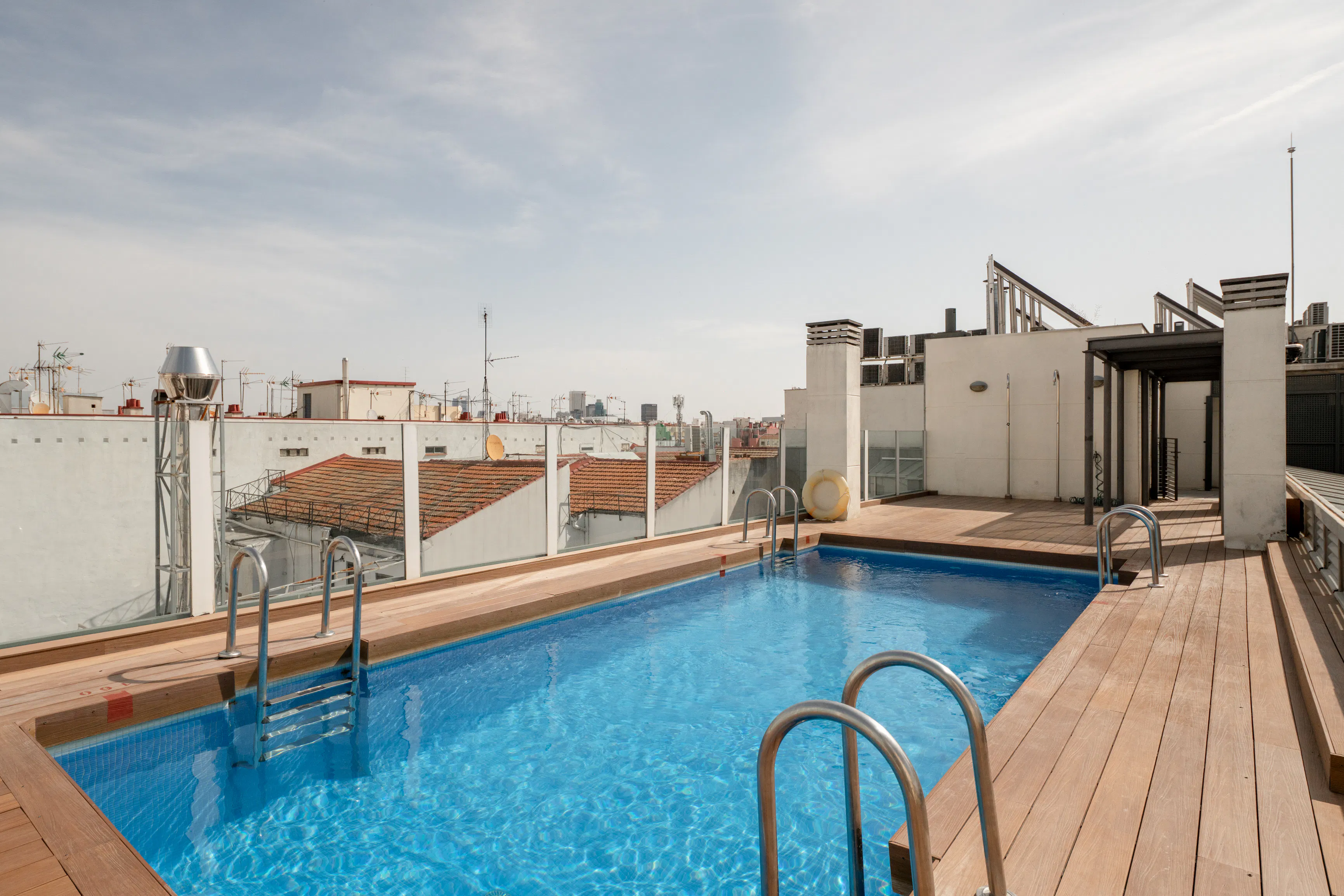 This unique 1 bedroom flat in the heart of Madrid mixes modern dark finishings and unique design. Walk into the 70 square meter flat to find a long dining table adjacent to the living room with a couch. Glass doors divide the living area with the patio. The indoor patio is fitted with a private office as well as chill out area which doubles as a convertible double bed. The space is adorned with white draping along the windows. The patio leads to a long terrace which has an outside dining area at one end and a lounge area at the other. The bedroom comes with a queen-sized bed and ample storage space. The terrace is accessible from the bedroom as well. The bathroom comes with full shower and fresh towels. The kitchen down the hall from the living room is fully equipped with all the cooking utensils and appliances. *Please note that the building amenities such as the pool and/or gym may have specific hours of operation and might not be available year-round. *We welcome pets, fees are subject to apply. Guests will be informed of any additional charges in the final contract. *We cannot be held liable for any noises (construction, or street noise) done outside the apartment. We also cannot be liable for any rooms without air conditioning (all the rooms with air conditioner will be explicitly explained in our description). We will not accept any reservation cancellations or refund request related to these two issues. *Our in-house design team expertly selects all apartment furniture and decor to ensure the highest level of quality and comfort. As part of consistent home upkeep, design improvements, and photo staging, there may be minor differences in furnishings seen in the photos and what you find in the apartment. Inquire with a sales agent for any questions or doubts...