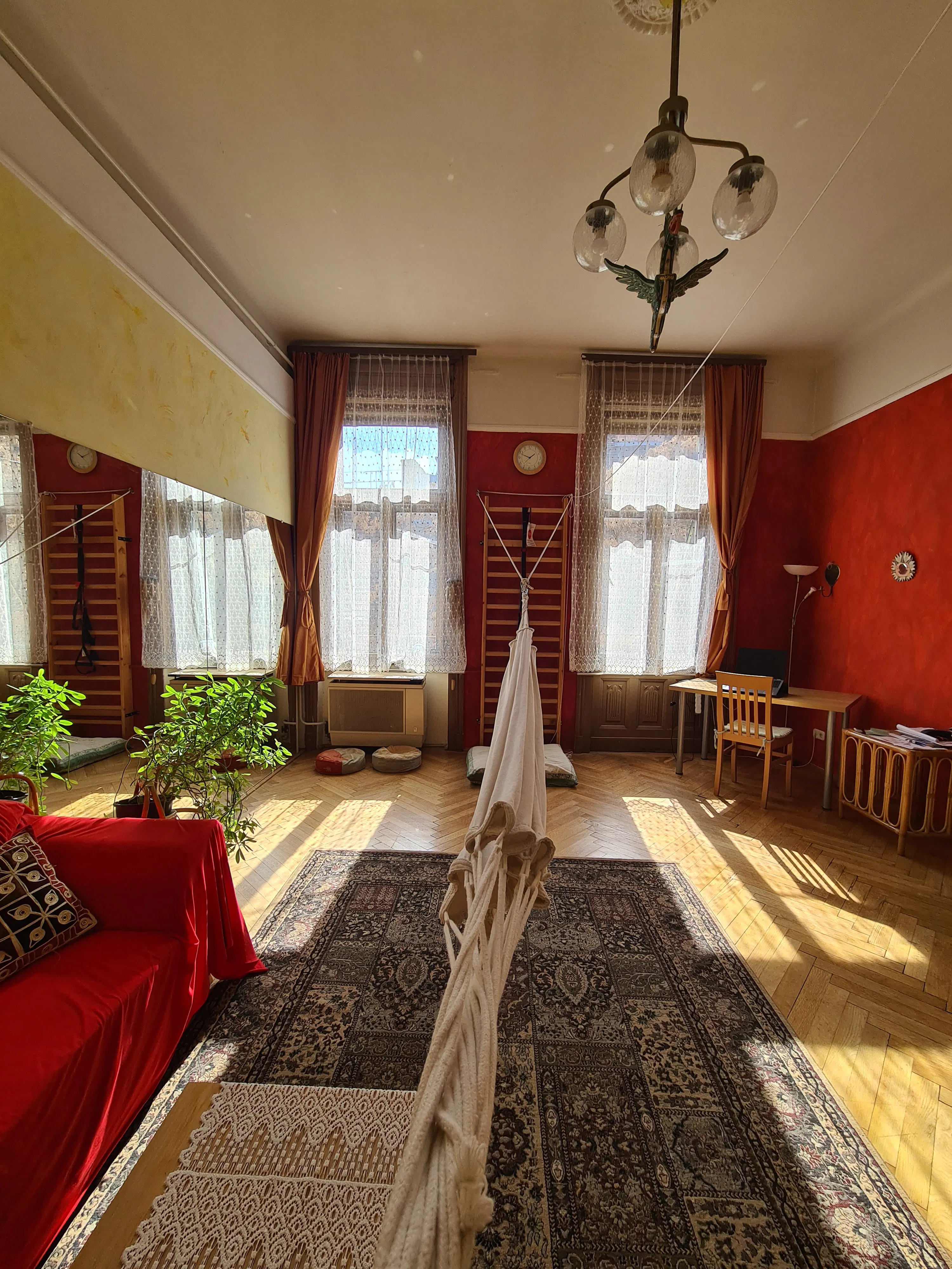 COZY, TRANQUIL top floor apartment in the Palace District in CENTRAL Budapest. BRIGHT, cozy, sunny eclectic chic with two bedrooms, a huge double and a single, plus spacious living room. HEALTH AND FITNESS FOCUS: a gigantic mirror, floor space to practice your yoga or workouts, a hammock to hang out in. SAFE area and building, near universities, inner city workplaces and social hubs. EASY ACCESS to public transport, airport, shopping, culture and nature. FAST INTERNET, ideal for students, digital nomads, working professionals. Enjoy your quiet, relaxed hideaway, then just join the hustle and bustle at the centre of the city, hangout in entertainment and cultural sites. The rooms The FLOOR PLAN: step into a hallway as you arrive, continue into the central kitchen and the dining area. The single room (orange) opens into the hallway near the entrance. The living-room (yellow) and the bathroom (blue) open at the other end of the hall. The double room (pink) opens from the living-room. The floor plan with the colours will help you orient. All rooms and other areas have nice windows and get lots of light all year round. The LIVING-ROOM: (yellow) chill out on the sofas or in the hammock, enjoy yoga pillows, yoga mat, and the huge mirrors. The windows overlook a lovely tree, you can watch robins and other birds come for the seeds. In the living-room, there is lots of space for cozy chats with friends. The DOUBLE BEDROOM: king size bed, big windows in the tree's canopy. A cozy armchair for reading by the window, a desk for your study, a dresser with a mirror to touch up your make-up. Lockable cupboards to store your stuff. The SINGLE ROOM: perfect for a comfy student life, a bed, desk, cupboards, and a secret, raised lounging area for two. The BATHROOM: neat, with hairdryer and a washing machine. The KITCHEN and DINING AREA: vibrant kitchen with all kitchenware necessary. Sunny breakfast table for your “sunny side up”. eggs and coffee. FAST Wi-Fi. TV connection is possible, not installed in general, but possible at extra broadcasting costs. BEST FOR: students and young professionals with a relaxed lifestyle, who like to be in the hustle and bustle of the city and enjoy a quiet space at home. There are lots of pubs and public places nearby to hold larger gatherings, noisy parties are not welcome in the house. Heavy drinking, antisocial behaviour and drug use would automatically terminate your opportunity of living here. Upon moving in, a deposit of a month’s rent is requested out of which the appropriate amount is withheld if belongings of the apartment are damaged. SMOKING: The apartment has always been smoke free, and no smoking is allowed. ACCESS: The apartment is on the 4th floor, easy to get up to with the elevator. There is no city noise, the air quality is better, and the apartment gets sunshine all year round. If you are a person with extreme fear of heights, consult me beforehand. NEIGHBOURHOOD PUBLIC TRANSPORT: You will be living in the so called PALACE QUARTER of Budapest. Just stepping outside the gate, you can join the festival in the hustle and bustle of the city centre. Most tourist sites at walking distance, with the Bu-Bi bikes that you can pick up in stalls all around, you can get around easily. Public transport stops are all around. All 4 metro lines, trams number 4-6, 47, 49, buses, train stations are near. Easy access from airport by bus number 100E. Parking is not free on the street in this area, but there are parking places to rent in parking plots nearby. STUDENT LIFE: several universities (ELTE, Corvinus, Semmelweis, Karolyi, etc.) are here, reachable on foot, on this or on the other side of the Danube. The Central Szabó Ervin Library is just opposite our building. Semmelweis Medical Library is also round the corner. Pubs, places to hang out with fellow students are all around. ENTERTAINMENT: the National Museum and most other museums can be reached easily on foot or a short trip via public transport. The popular Ráday Street with restaurants and pubs, designer shops, cinemas, and Váci Street for shopping sprees. There are shopping centres, many with cinemas at a walking distance. If you walk the nearby bridge over the Danube, you can choose which lovely spa to enjoy, the art nuoveau Gellért or the freshly refurbished Rudas from Turkish times. A walk up Gellért Hill rewards you with a postcard panoramic view of the city. The legendary ‘RUIN PUBS’, open air cafes and restaurants are a stone’s throw away. GROCERIES: the famous indoor CENTRAL MARKET is 8 min. walk. There is an ALDI with all the necessary stuff open for long hours under a neighbouring house. There are shops open 24-7 just 6 min walk away. SPORTS: Lots of indoor and outdoor places to workout. Swimming pools are available in nearby spas, some open in winter too. Jog along the running track along the Danube or Margaret Island, do some cardio hiking up Gellert hill, catch the sunset from the top, or take a blanket and chill out on the grass in Károlyi Gardens, or the lush green park around the National Museum. There are organic food shops and organic restaurants nearby. You can find vegan, vegetarian, lactose free, gluten free products in shops, restaurants, cafes and ice-cream parlours. I can provide you with a starting list. Preferably the apartment is rented for 3 months initially with the possibility of extension in case of problem-free tenancy. Let me know in your request if you plan a longer stay. What others say: (Ben) A truly excellent experience. The flat is charming and in a very good location for exploring the city. It also happens to be super simple to get there from the airport. The bed was unusually comfortable and the whole place had a warm, relaxing Bohemian vibe. Spacious and with a good working kitchen the flat was a superb base for our stay. Budapest is a very interesting city and if you make the trip then I heartily recommend staying here. You’ll love it. (Mary) Agnes' apart