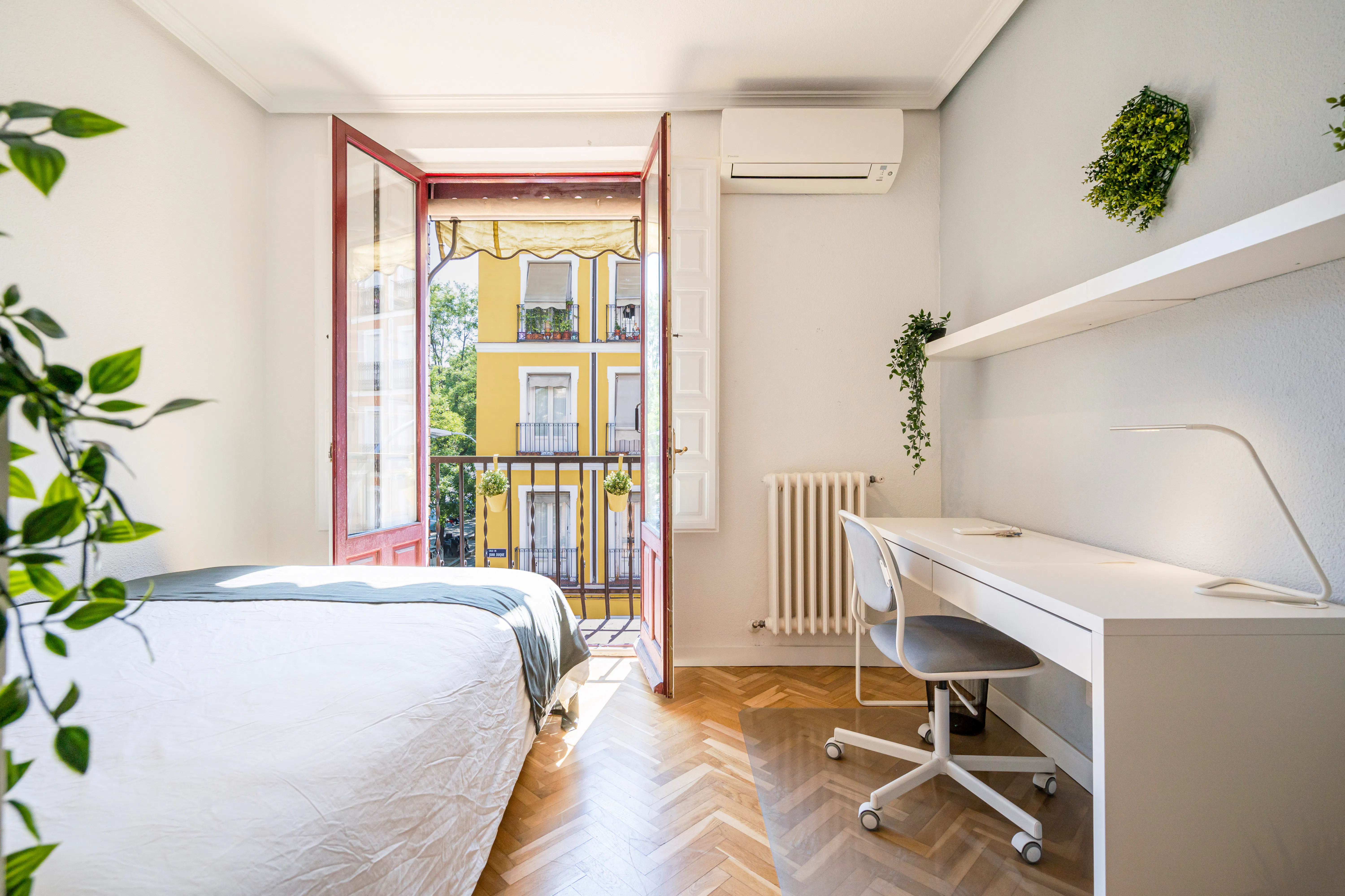 Se trata de una habitación, en un amplio piso ubicado en el centro de Madrid, cerca de la zona de Príncipe Pío e ideal para estudiantes y jóvenes profesionales. Es un apartamento de 7 habitaciones, de las cuales, cuatro tienen balcón, dos baños compartidos, aire acondicionado, una pequeña zona de comedor y cocina equipada con cocina, horno, microondas, vajilla, una lavadora y secadora. Todos, cuentan con armarios, mesas de estudio con lámpara, juego de sábanas y toallas. El apartamento está ubicado en la Calle de Segovia, cerca del Palacio Real y realmente bien comunicado tanto en bus como en metro. Hay muchos buses que te acercan hasta el intercambiador de Príncipe Pío (líneas 6, 10 y ramal de metro) y además hay buses que llegan constantemente tanto interurbanos como de largo recorrido. También hay muchos otros buses que te llevan directamente hasta la plaza mayor. ¿A qué esperas para alquilar tu nuevo piso en Madrid...