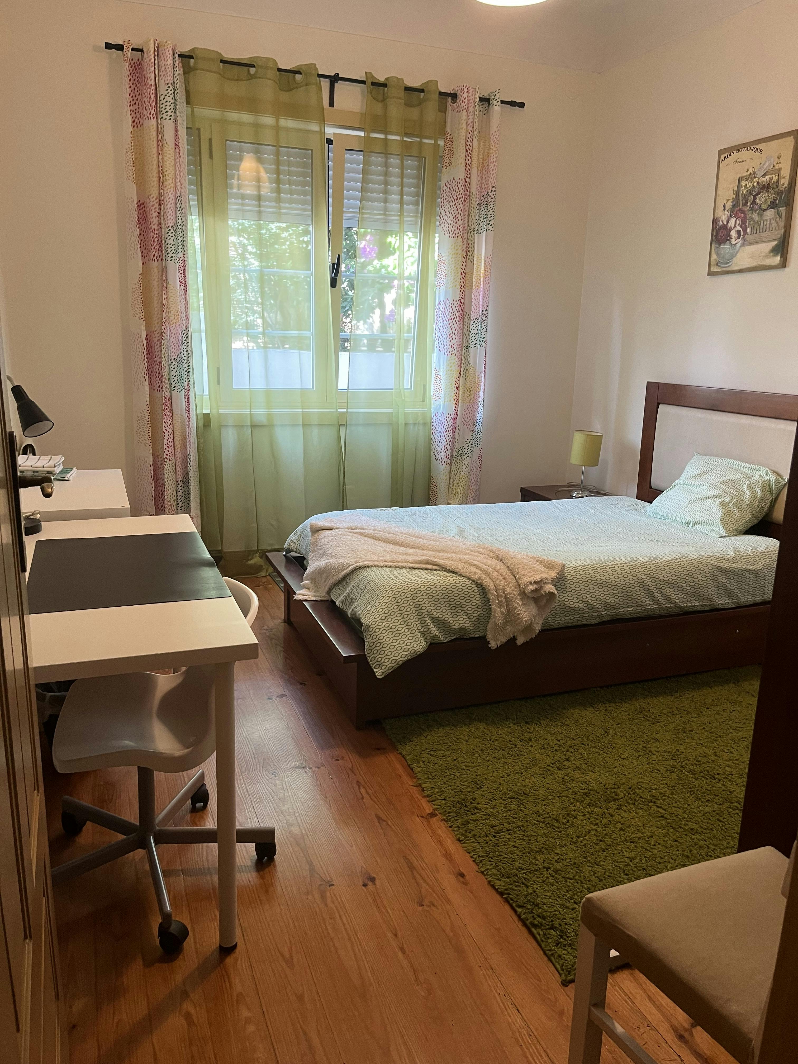Este quarto de SOLTEIRO situa-se nas traseiras do prédio e partilha casa de banho completa e toilette, assim como a cozinha com mais 2 residentes. A sala é comum aos 5 habitantes. Os 2 residentes da frente têm casa de banho e kitchenette individual. A cama foi substituída. Há um teto máximo de 40 euros para despesas de eletricidade e água e a caução só é restituída se não houver estragos e não sair antes do fim (anular) do contrato. Apesar de não ser permitido às visitas pernoitarem, pontuais visitas noturnas terá um adicional de 15€/noite...