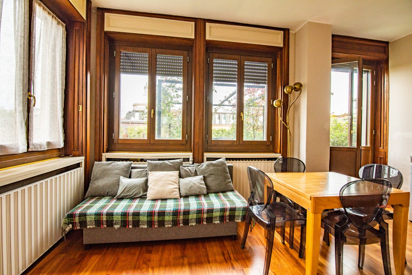 L'appartamento si trova a 400 m. dal Duomo di Milano. E' collocato in un palazzo storico ed elegante con portineria e due ascensori. Benchè situatonel cuore della città, garantisce un ambiente di grande quieteal riparo dai rumori della città. Dalla magnifica terrazza di 200 mq godrete di una splendida e imparaggiabile vista su sui palazzi storici del centro di Milano e ammirerete la guglia centrale del Duomo con la famosa "Madonnina" L'appartamento è composto da una camere da letto e da un ampio soggiorno/cucina. Vi è poi un comodo bagno Nella sua grande terrazza vi è un grande tavolo per mangiare, un salottino e due comodi lettini per godere del sole e potersi riposare Elettrodomestici: lavatrice, frigorifero, microonde, piastra di cottura a induzione a 2 fuochi. Equipaggiamento completo per i pasti per 4 persone. Ha 1 letto matrimoniale e 1 divano letto doppio. Lenzuola, coperte e corredo asciugamani per tutti gli ospiti vengono forniti al check in. Il riscaldamento, l'acqua calda sanitari e l'aria condizionata sono gestiti centralmente e compresi nei prezzi indicati E' dotato inoltre di, wifi, asciugacapelli e ferro da stiro....
