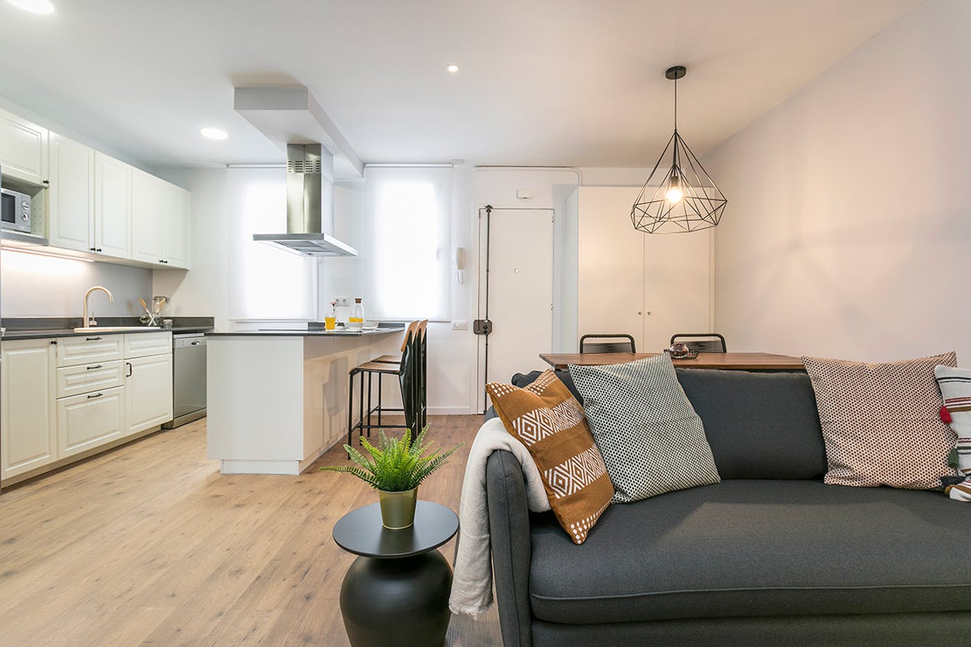 *Monthly rental apartment (from 32 to 40 days)* Located in Barcelona's very central area, a few blocks from the Ramblas, we find this beautiful apartment of 55 sqm very well distributed. The day area consists of a spacious living room decorated with great taste. The kitchen is integrated and is fully equipped with all the necessary appliances, all of them high end. The night area consists of two comfortable double bedrooms with a practical desk, perfect for studying and working. The apartment has heating, air conditioning and wifi. It is fully equipped and furnished and includes all appliances and equipment, and bedding, ready to move in. Located in Carrer de Lluna, right in the historic center of the city. A few blocks from the famous Rambla, one of the most important streets of the city, as it connects the heart of Barcelona, Plaza de Catalunya with the port. This area is surrounded by narrow streets and small squares that are strategically located to sit and enjoy a drink or a snack. It is also fully supplied with all services, stores and supermarkets. The neighborhood of Sant Antoni, which has a quiet and residential atmosphere is just a few blocks away. The nearest station is Sant Antoni (L2), 4 minutes from the apartment. SERVICES INCLUDED: - Check in and Check out in the apartment - WIFI included in all our apartments - Maintenance included (For damage due to normal use) - Fully equipped and furnished apartments - Multilingual manager assigned during the entire stay TERMS: - Deposit for stays shorter than 3 months: 1 month's rent - Deposit for stays longer than 3 months: 2 month's rent - Maximum Stay: 11 months - Registration Possible only for stays longer than 6 months - The utilities of Gas, Water and Electricity are not included in the renting price LOCAL TAXES (I.T.P.): 0.5% of the total reservation (Monthly cost calculated as "other" in the Rent summary. The total amount will be collected before the check-in). Be aware that HousingAnywhere is an online booking platform. Therefore exchanging CONTACT DETAILS and offering VIEWINGS is NOT POSSIBLE. The platform keeps your payment safe until 48 hours after your move-in date. In case the accommodation is not as advertised, you will be entitled to get a refund. “BOOKING PROCESS: After the reservation is confirmed, you will be required to pay the remaining payments directly to the advertiser before the handover of the keys...
