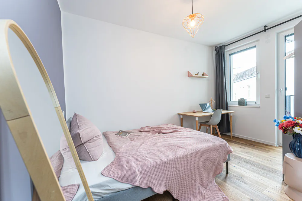 Welcome to our new Village M location in the west of Berlin, where you bring the spirit and we take care of the rest! Our large number of co-living apartments all consist of spacious and bright rooms in a modern design. The best part is, everything is already fully furnished. In other words, you can literally grab your suitcase and move in tomorrow! All of the rooms are already equipped with the essentials like heating, electricity, water and internet. We are located in ‘Charlottenburg-Wilmersdorf’, which is one of the greenest areas in all of Berlin.The building is 5 min walking distance away from S Hohenzollerndamm (S41/S42 - Ringbahn, S46) and few minutes away from the Grieser Platz bus stop, bus nr 110. The nearest supermarkets are Edeka and Lidl. There are also plenty of cafes and shops around: Trattoria Il Gusto Italiano Pizzeria, Restaurant Feigen&Oliven, Trattoria Don Carlo, Backstube Zuckersüß, Restaurant Genazvale and more. The building is close to Bürgeramt Hohenzollerndamm, and just few minutes walking distance away from the Stadtbad Wilmersdorf II - Berliner Bäder Pool and the Sommerbad Wilmersdorf. The area is very central, but at the same time very green, so it ́s perfect for walks and outdoor activities. With open-minded and international people this place will not only provide you with an amazing new home, but you will also be part of our international and open-minded community, that you do not want to miss out on. Services / facilities that are INCLUDED in the price: - heating, electricity, water - high speed internet - security (camera surveillance) - bicycle parking spaces - community manager - great location - *laundry room (including washing machine & dryer) *Please note that although a common laundry room is included in the price, the costs per washing cycle / program are paid individually (2,80€ washing machine & 2,50€ dryer) and are therefore not included in the overall price. Additional services / facilities that are NOT INCLUDED in the price: - parking space What exactly does “fully equipped” mean? Being able to move into a new place the next day does not happen very often, yet we make it possible! Therefore, we have not only taken care of all the necessary amenities, but these are also included in the price and do not involve any additional charges. To give you an overview of your new home, we have listed all of the integrated facilities below: The apartment: • equipped kitchen • oven • *balcony / terrace The bedroom: • wardrobe • desk • chair • mirror • hanging lamp • bed (140 cm) • mattress • blanket • pillow • curtains • shelf • drawer • shared balcony / terrace (access from CU.41.1 & CU.41.2) *Please note that not all of the rooms have a balcony or terrace. Furthermore, those that do are sometimes shared and therefore more than one room may have access to the same balcony. The exact details of each individual room within the apartment can be seen on the according floorplan, which is included in the pictures. REQUIRED documents: - Proof of income (last 3 months) or work contract - Proof of enrolment (students) - Guarantor (only if you do not have proof of income) - Copy of guarantor's ID (only if you do not have proof of income) - Copy of guarantor's work contract (only if you do not have proof of income) *the landlord only accepts tenants under the age of 40* Check-in /out: - Check-in hours: Monday - Friday from 10:00 - 16:00 - The key transfer will take place at the building (you will receive the address once your booking is confirmed) IMPORTANT!!! Please take into account that the decoration is solely included for inspirational purposes and will not be present in your room...