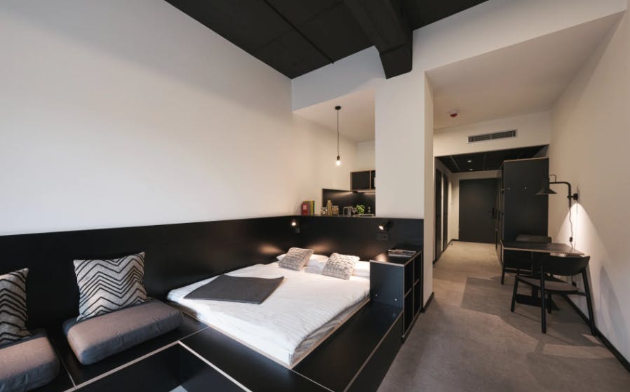 Unsere maßgeschneiderten Studios vereinen Highend Design und Funktionalität und gewähren somit maximalen Wohnkomfort auf geringem Raum. Mit einer umfangreichen Ausstattung erfüllen unsere Studios alle Bedürfnisse einer privaten Wohnung und bieten zugleich zahlreiche Services eines Hotels. Ob smartes Wohnen auf kleinem Raum oder luxuriöses Leben in großzügiger Atmosphäre. Lichtdurchflutetes Apartment, auf ca. 38 -44 qm2 kannst Du Dich frei bewegen, Du hast eine vollausgestattete Küche, einen coolen Bartisch mit Barstuhl für deinen morgendlichen Espresso, einen Esstisch, ein Bad mit Dusche, einen großen Schreibtisch, viele USB-Buchsen, viel Stauraum, Dein bequemes Bett 1,60 x 200 und anstatt eines Sofas eine gemütliche Sitzbank. Neben deinem eigenen Studio kannst du dich in unseren zahlreichen Gemeinschaftsräumen, wie der Community Kitchen oder der Co-Working Lounge zuhause fühlen und Kontakte knüpfen. Nutze kostenfrei das WLAN, den Fitnessraum und die Wallbox, profitiere von dem wöchentlichen Wäschewechsel oder parke dein Auto oder Fahrrad in unserem Parkhaus. Our tailor-made studios combine high-end design and functionality and thus ensure maximum (hidden) comfort in a small space. With extensive equipment, our studios meet all the needs of a private apartment and at the same time offer numerous services of a hotel. Whether smart (hidden) in a small space or luxurious (hidden) in a spacious atmosphere. Light-filled apartment, you can move freely on approx. 38 - 44 square meters, you have a fully equipped kitchen, a cool bar table with bar stool for your morning espresso, a dining table, a bathroom with shower, a large desk, many USB sockets, lots of storage space, yours comfortable bed 1.60 x 200 and instead of a sofa a cozy bench. In addition to that, there is also some shared space in the building like a big kitchen/(hidden) room, gym, table soccer tables and laundry facility...