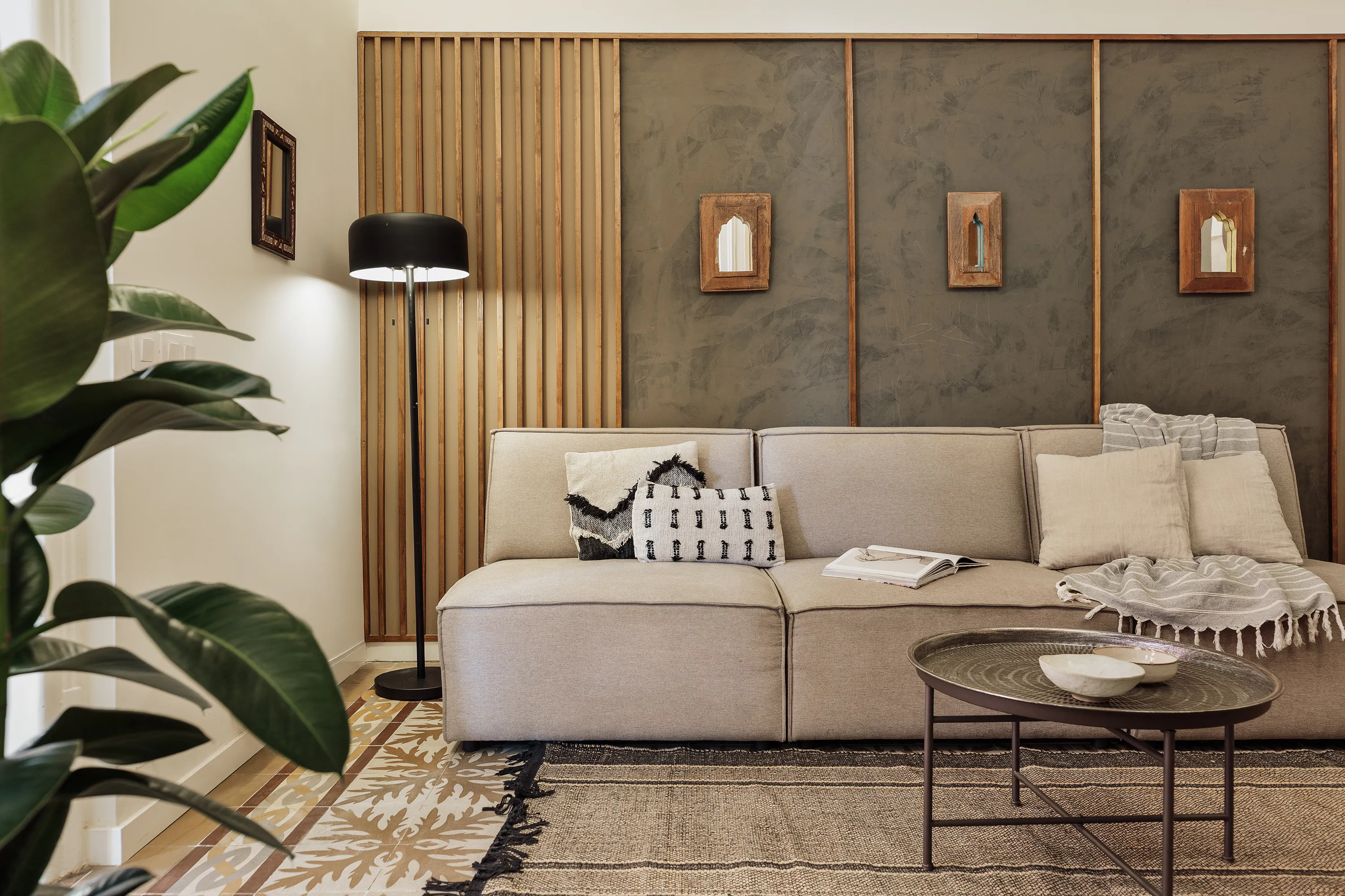 Evoking a Saharan experience, all 110 square meters of Erfoud’s space feel exquisitely on-theme. This three-bedroom, two-bath beauty rests in the heart of Gracia. Known for its eclectic charm, Gracia boasts an array of artisanal shops and local eats. When it's time to rest, step inside Erfoud’s escape. A unique feature to Barcelona builds, Erfoud offers a spacious foyer, complete with chandelier lighting and an entry table. Erfoud’s foyer then branches off into a left and right hall with traditional Catalan tiling leading the way. The first door down the left hallway reveals a multi-functional space. Inside this room, the left offers built-in storage while the right door within the space leads to a full bathroom with a curbless, walk-in shower. Continue down the hall to find the kitchen through the next left door. The kitchen feels luminous with backlit countertops and all-white cabinetry. The space is equipped with modern appliances and all the necessary kitchenware. The door at the end of the hall opens up to Erfoud’s salon. The living room is a divine blend between North African design and Catalan classics. A traditional fireplace matches the feel of the ceramic tiling underneath while the Celosia-framed sofa and natural fiber rugs give the room a Saharan flare. The door to the left of the living room leads to Erfoud’s first bedroom(hidden)anic textiles cover the queen-sized bed. The room is complete with slate-hued, floor-to-ceiling storage. Back through the living room, the door at the end of the space leads to a sunlit four-person dining area. The all-glass back wall and lantern lighting provide a multitude of options for radiance. To the left of the dining room is the second bathroom complete with a walk-in shower. Heading back to the entrance and into the second hallway, the first door on the right reveals another multi-purpose space. Perfect for visitors or productivity, a dedicated workstation sits in the left corner while the far end of the room offers a comfortable daybed. At the end of the hallway is the final bedroom. Rich tones of caramel creams and earthy browns blend to create a luxurious space. The queen-sized canopy bed stretches towards the vaulted ceilings. The right of the room offers floor-to-ceiling storage while the left of the bedroom reveals a balcony overlooking the Gracia landscape. For freshness, this apartment comes equipped with air conditioning in the Living Room. All bedding and linens provided. *We welcome pets, fees are subject to apply. Guests will be informed of any additional charges in the final contract. *(hidden) cannot be held liable for any noises (construction, or street noise) done outside the apartment. We also cannot be liable for any rooms without air conditioning (all the rooms with air conditioner will be explicitly explained in our description). We will not accept any reservation cancellations or refund request related to these two issues. *Our in-house design team expertly selects all apartment furniture and decor to ensure the highest level of quality and comfort. As part of consistent home upkeep, design improvements, and photo staging, there may be minor differences in furnishings seen in the photos and what you find in the apartment. Inquire with a sales agent for any questions or doubts. *This accommodation may only be used for stays longer than 31 nights for personal purposes such as holiday, recreational, or leisure. We may request documentation proving your permanent residence and the reason for your stay in Catalonia, and may cancel the reservation if it does not meet the legal requirements. The information provided may be submitted to the relevant registry and/or administrative authority in accordance with Catalan regulations....